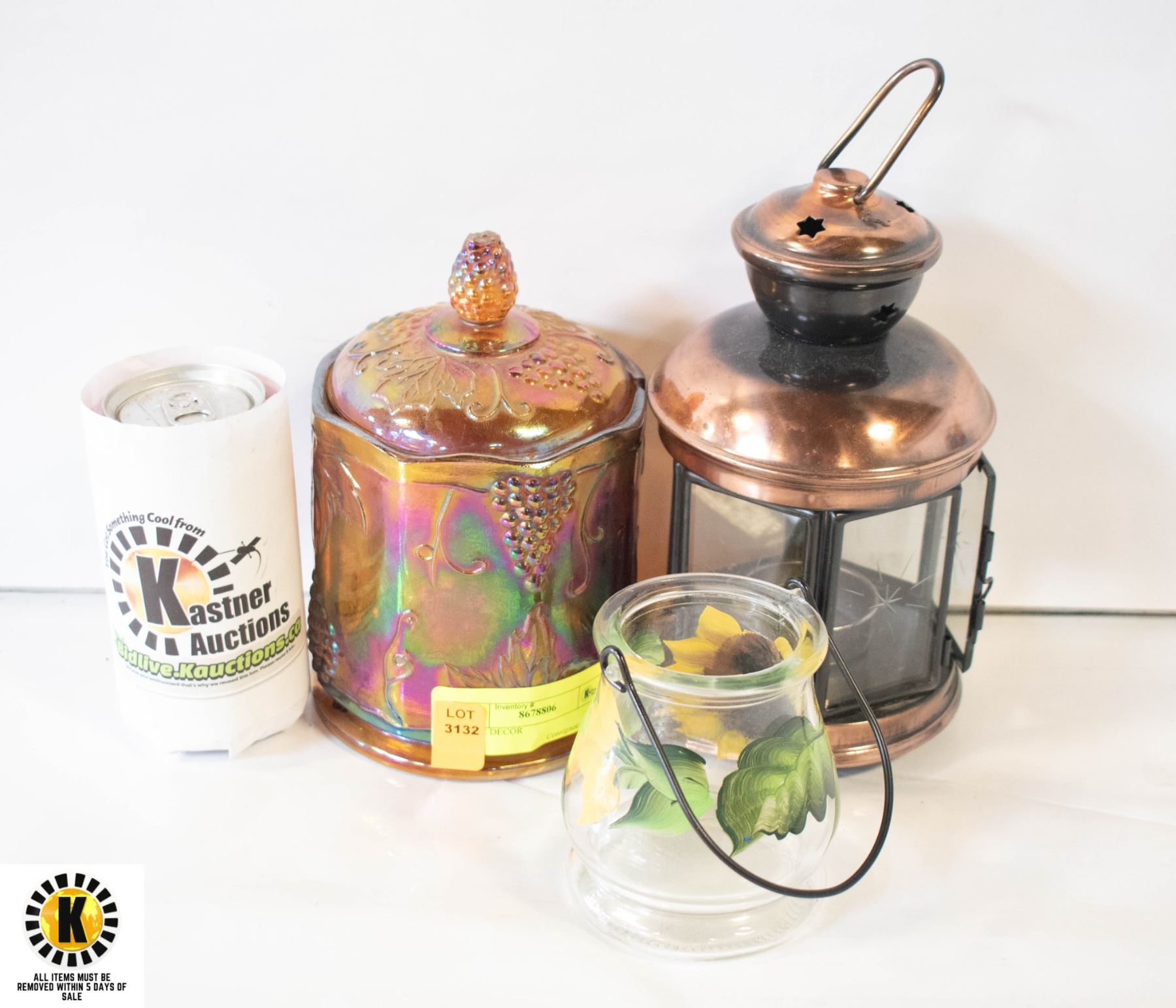 CARNIVAL GLASS CANDY DISH WITH LID AND 1 ANTIQUE STYLE CANDLE HOLDER AND 1 GLASS HAND PAINTED TEA LIGHT CANDLE HOLDER