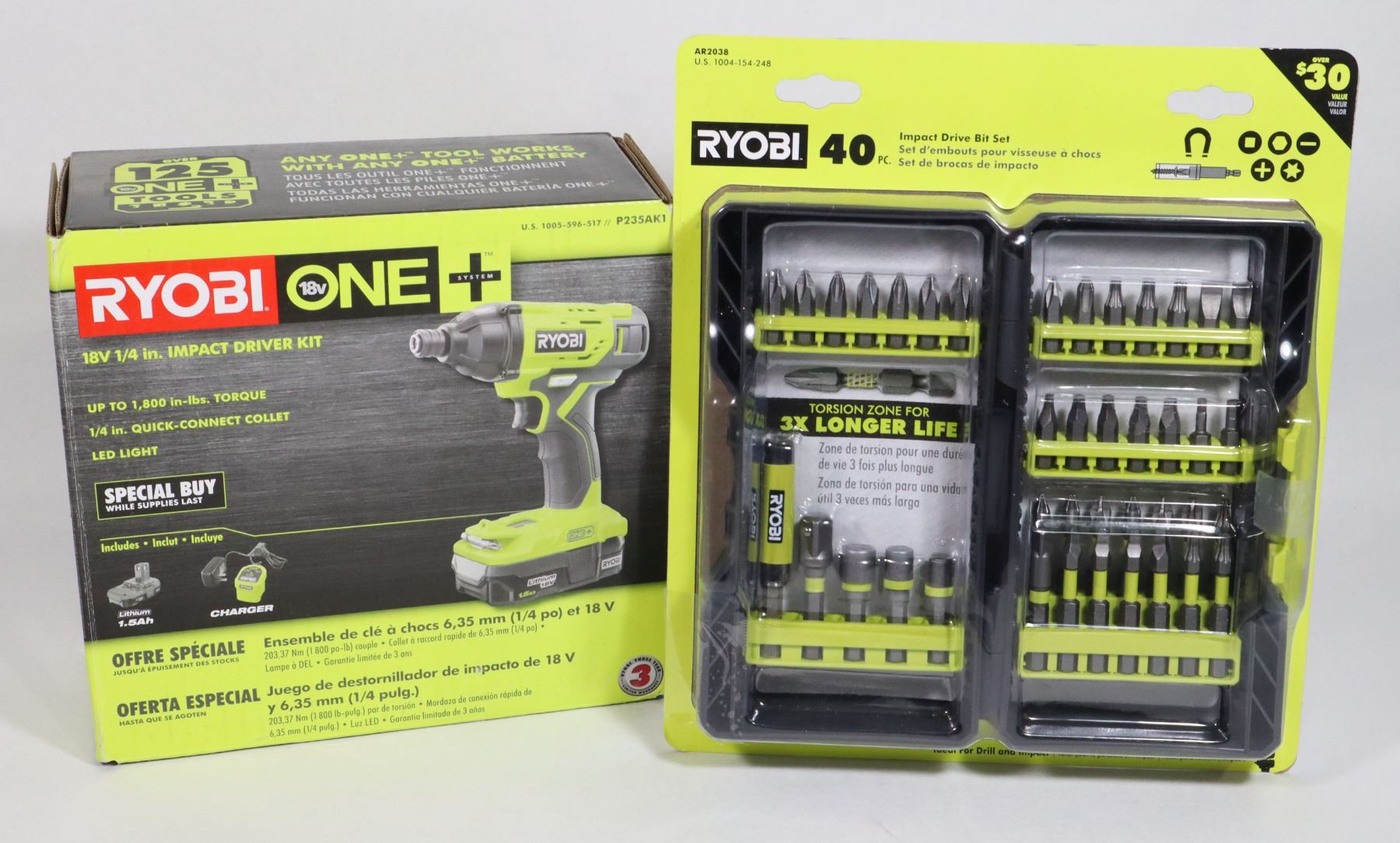 BY RYOBI ONE +. KIT INCLUDES AN 18V 1/4" IMPACT DRIVER (UP TO 1,800 IN-LBS TORQUE, 1/4 IN QUICK-CONNECT COLLET, VARIABLE SPEED TRIGGER, LED LIGHT) , 1.5 AH LITHIUM BATTERY, CHARGER, MANUALS, AND RYOBI 40 PC IMPACT DRIVE BIT SET.