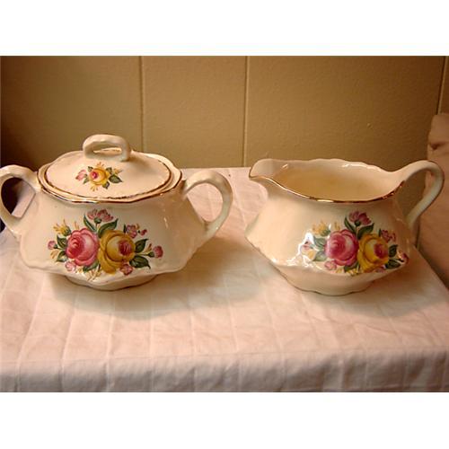 The sugar bowl is has the old Homer Laughlin stamp and the creamer is stamped Taylor Smith Taylor. The sugar bowl is dated 1942 and the creamer is dated 1943.