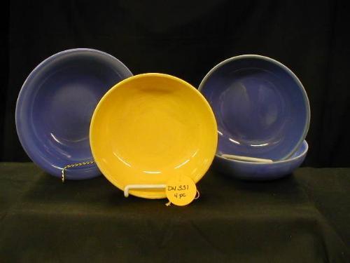 HOMER LAUGHLIN HARLEQUIN INCLUDES (1) 9in NAPPY BOWL (W/ RIM CHIP), (3) SALAD BOWLS 7 1/4in : (2) BLUE (1 W/RIM CHIP) (1) YELLOW, 4 PC