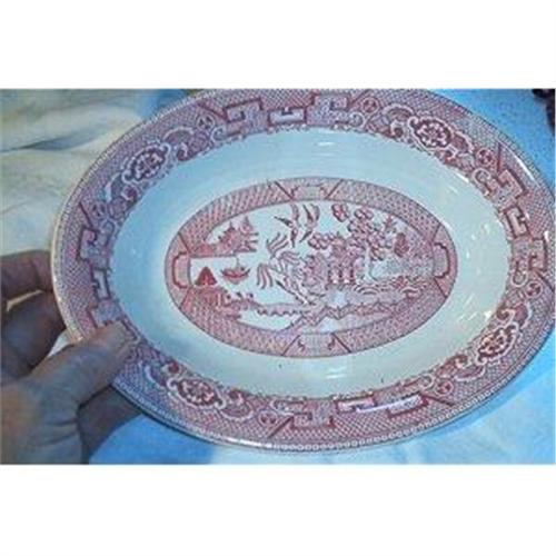 HOMER LAUGHLIN RED WILLOW 42/44 Two serving pieces Homer Laughlin Red or Pink Willow patter. One dish is stamped 44/the other 42. ONE OVAL serving bowl and ONE ROUND serving bowl. The round bowl has a miner chip which is on the underside. This is part of a three generation collection.USA SHIPPING ONLY