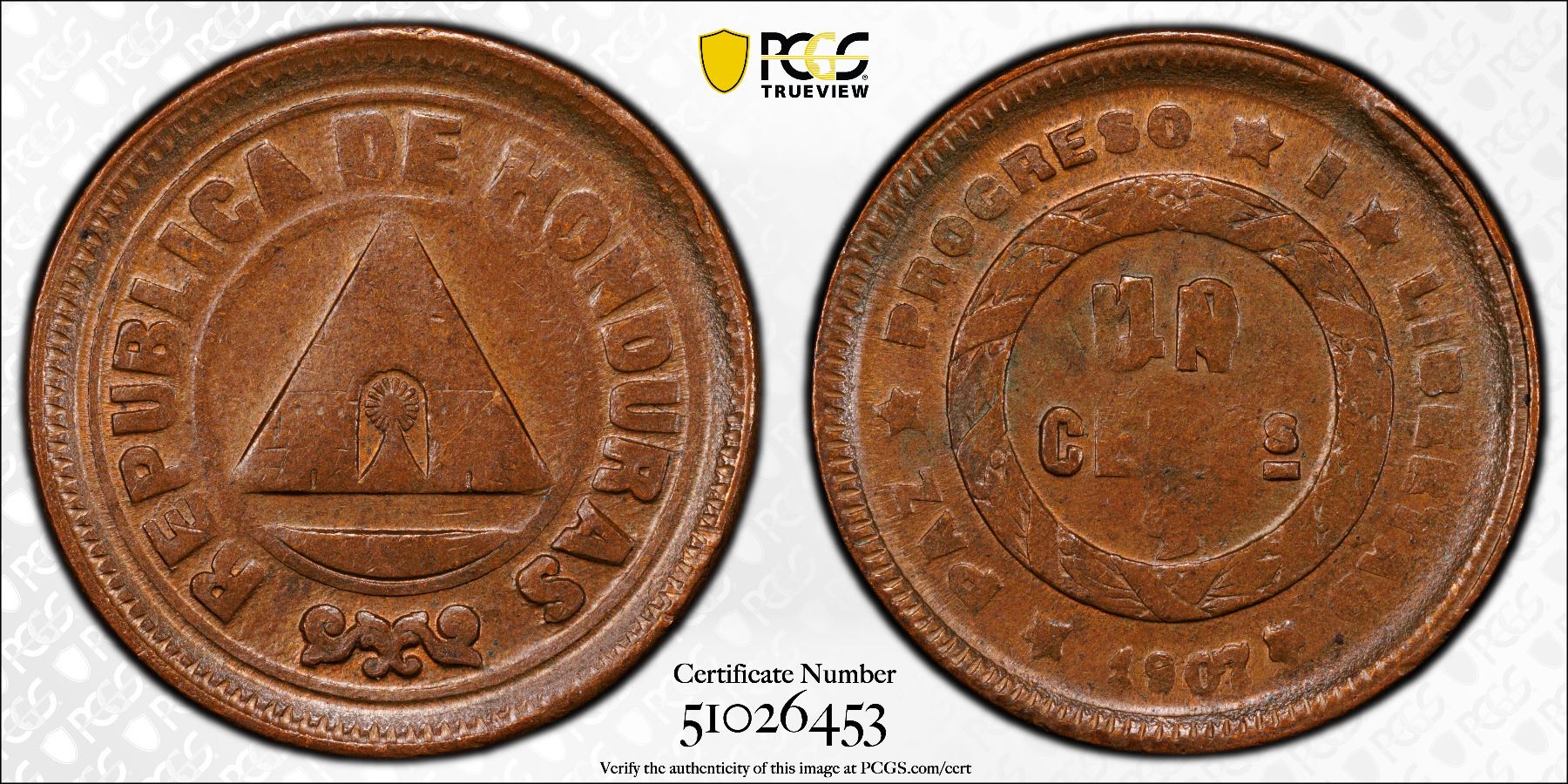 HONDURAS: Republic, AE centavo, 1907, KM-59, Y-15, a lovely mint state example! PCGS graded MS63 BN, ex Almer H. Orr III Collection. The reverse die of KM-59 was modified from the reverse die of 10 centavos KM-49 with the word UN stamped over the numeral 10. The small liberty head was retained, and the letter 's' for the plural denominational name was also retained.