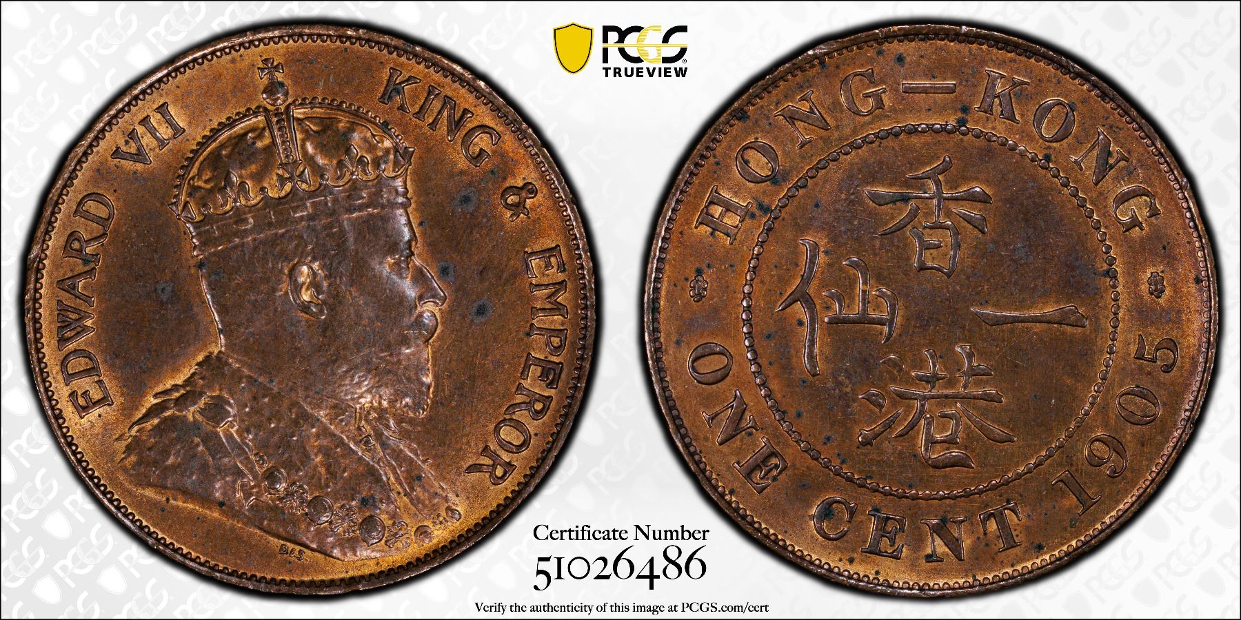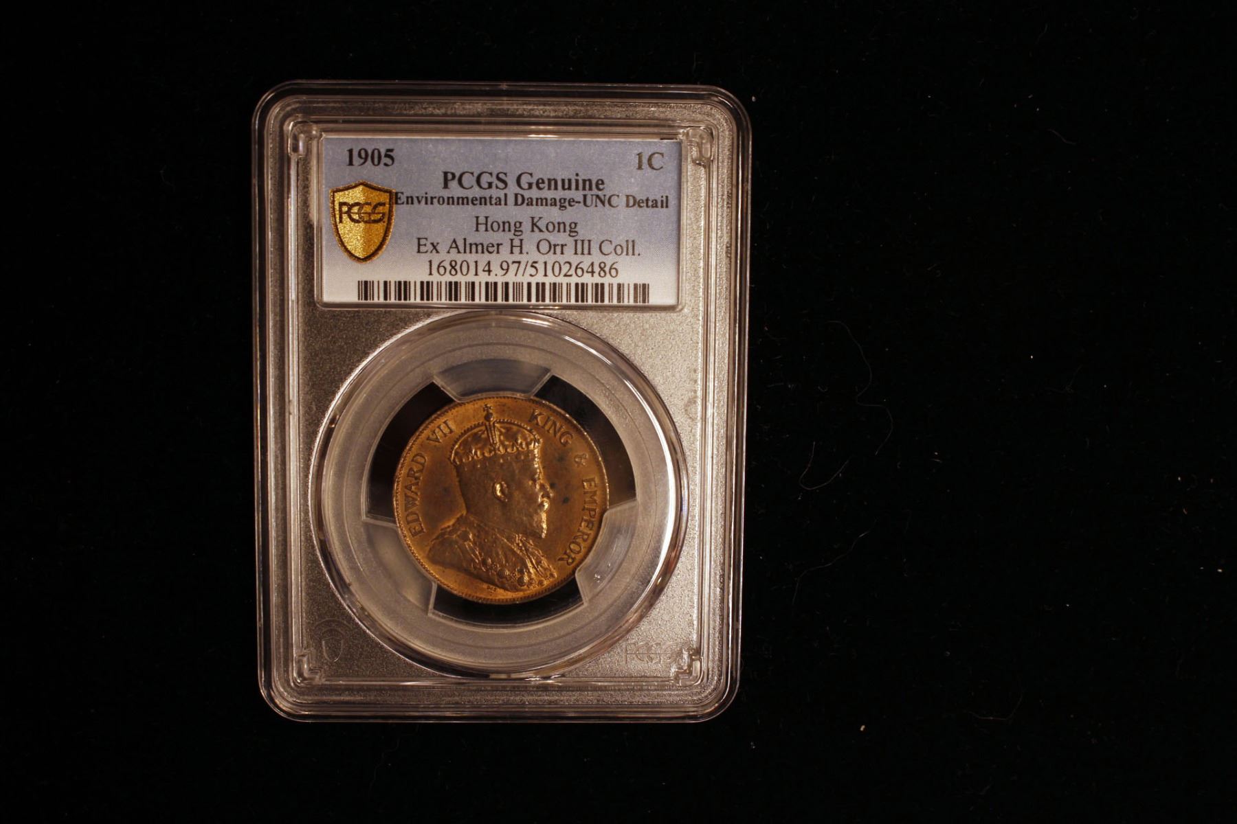HONG KONG: Edward VII, 1901-1910, AE cent, 1905, KM-11, red lustrous, environmental damage, PCGS graded Unc details, ex Almer H. Orr III Collection.