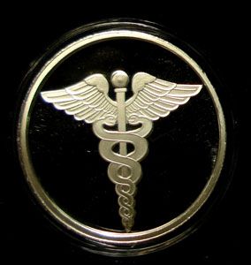 HONORING THE MEDICAL PROFESSION, CADUCEUS SYMBOL ON A ONE OUNCE .999 ROUND