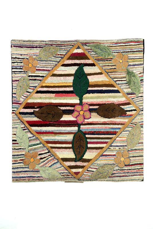 American, early 20th century, wools and cottons on burlap. Quatrefoil floral design within a diamond on striped ground. Good color. 40" x 43". Mounted.