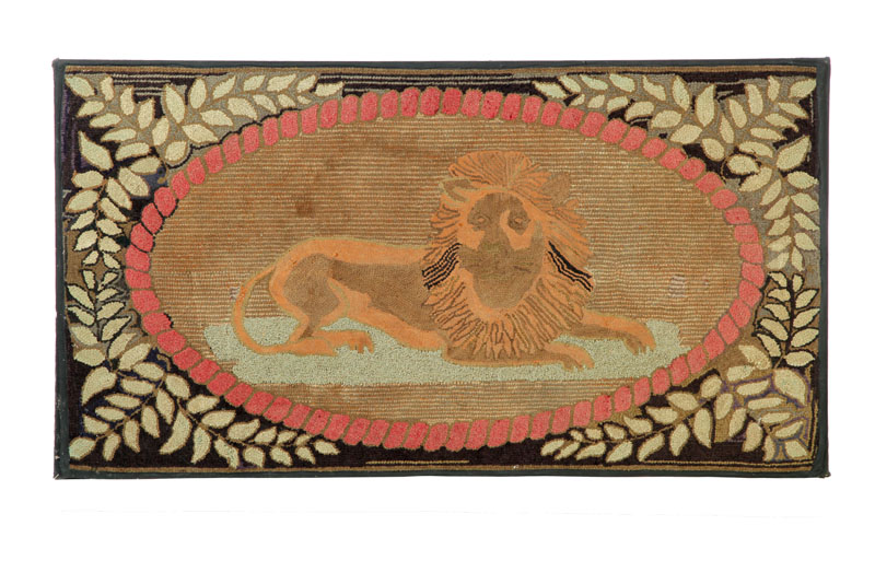 American, late 19th-early 20th century, mixed fibers including wool. Lion in oval with floral spandrels. Imperfections. On a stretcher. 30 +"h. 56 +"w.