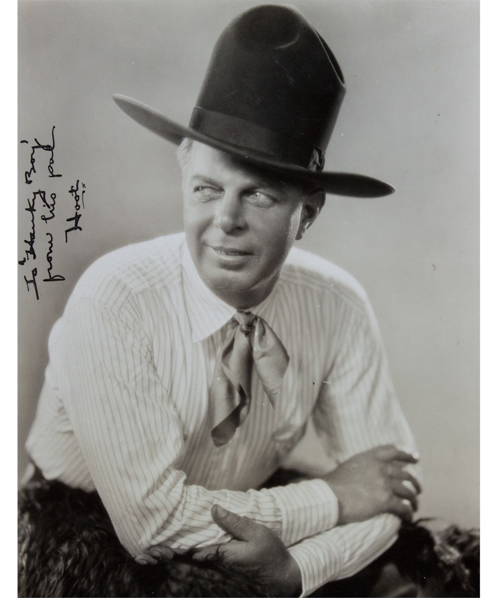 (1892 - 1962) American film actor, a silent screen star of silent films. Superb vintage I.S.P., 7" x 9 1/4" (sight) b/w, a half-length seated pose in cowboy hat and chaps, signed at left: "To 'Hanky Boy' from his pal Hoot". Fine.