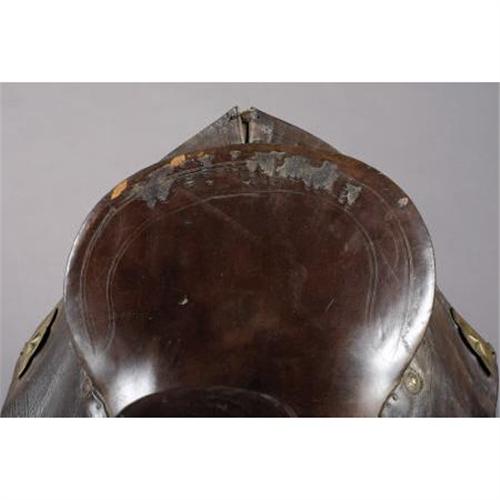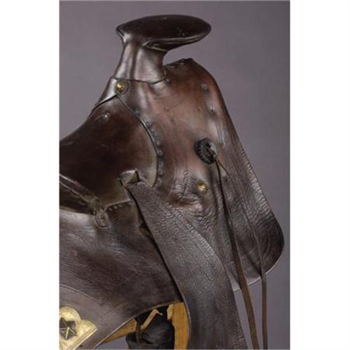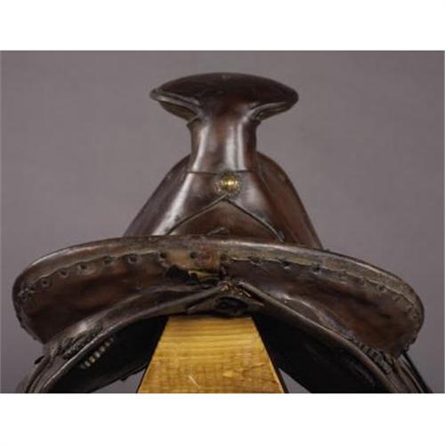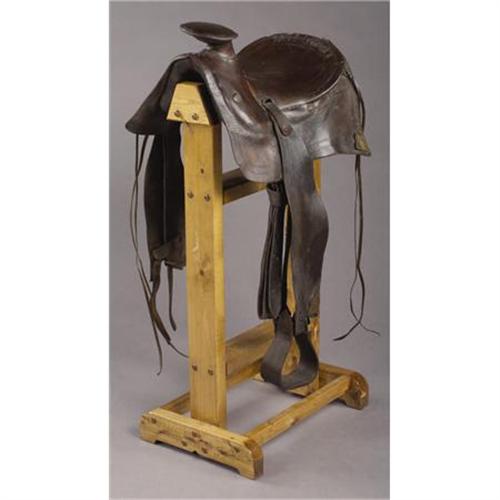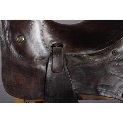 <B>HOPE STYLE TEXAS TRAIL SADDLE CIRCA 1860's</B></I> - Classic style; missing right stirrup; small square skirts; decorative brass skirt corner plates; line tooled; <BR><BR><B>Condition:</B></I> Fair; plates missing on fenders; age cracked overall.<BR><BR><b>Shipping:</b> Other (oversized items, group lo (<a target="_blank" href="http://www.heritageauctions.com/common/shipping.php">view shipping information</a>)
