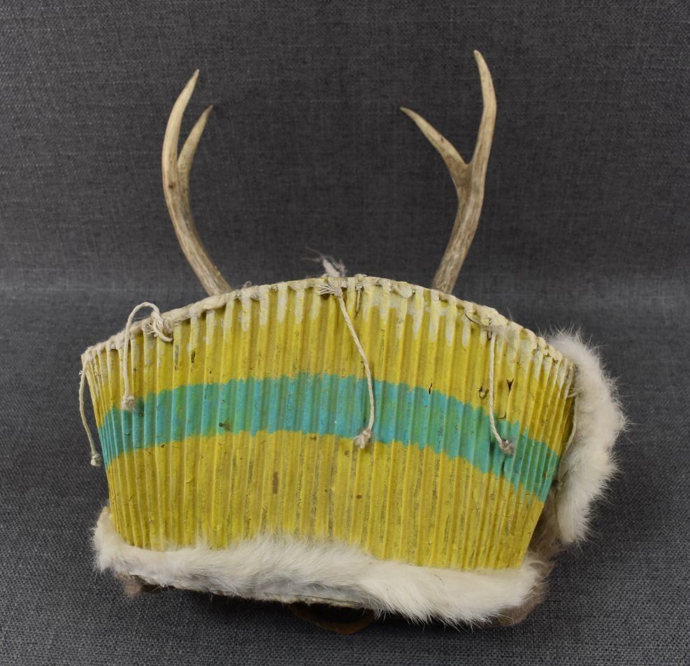 1980-90's Hopi Indian hand made from commercial fur deer antlers and painted cardboard with leather head band signed Neil David Jr 14" x 10" x 8"