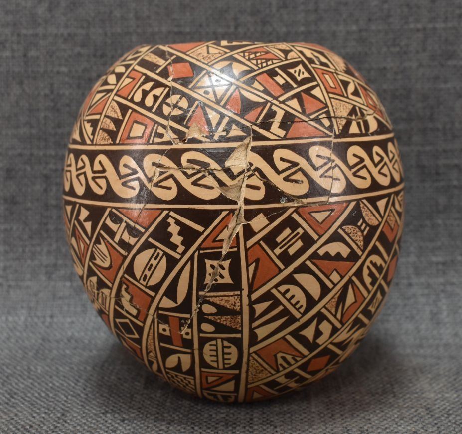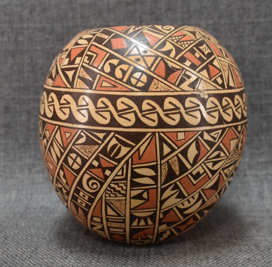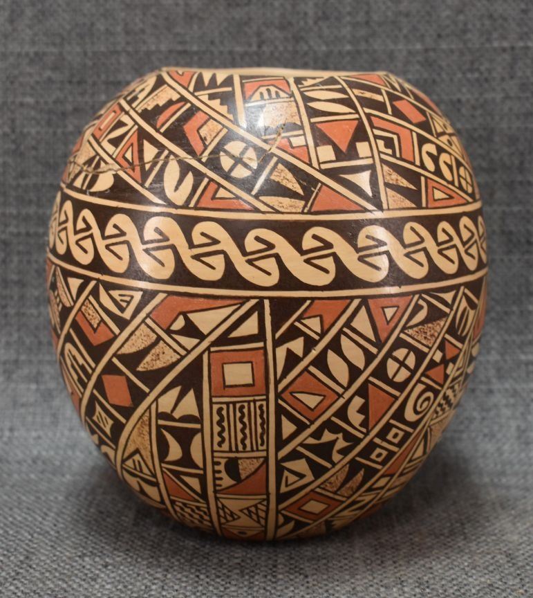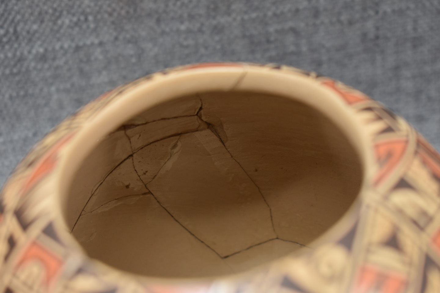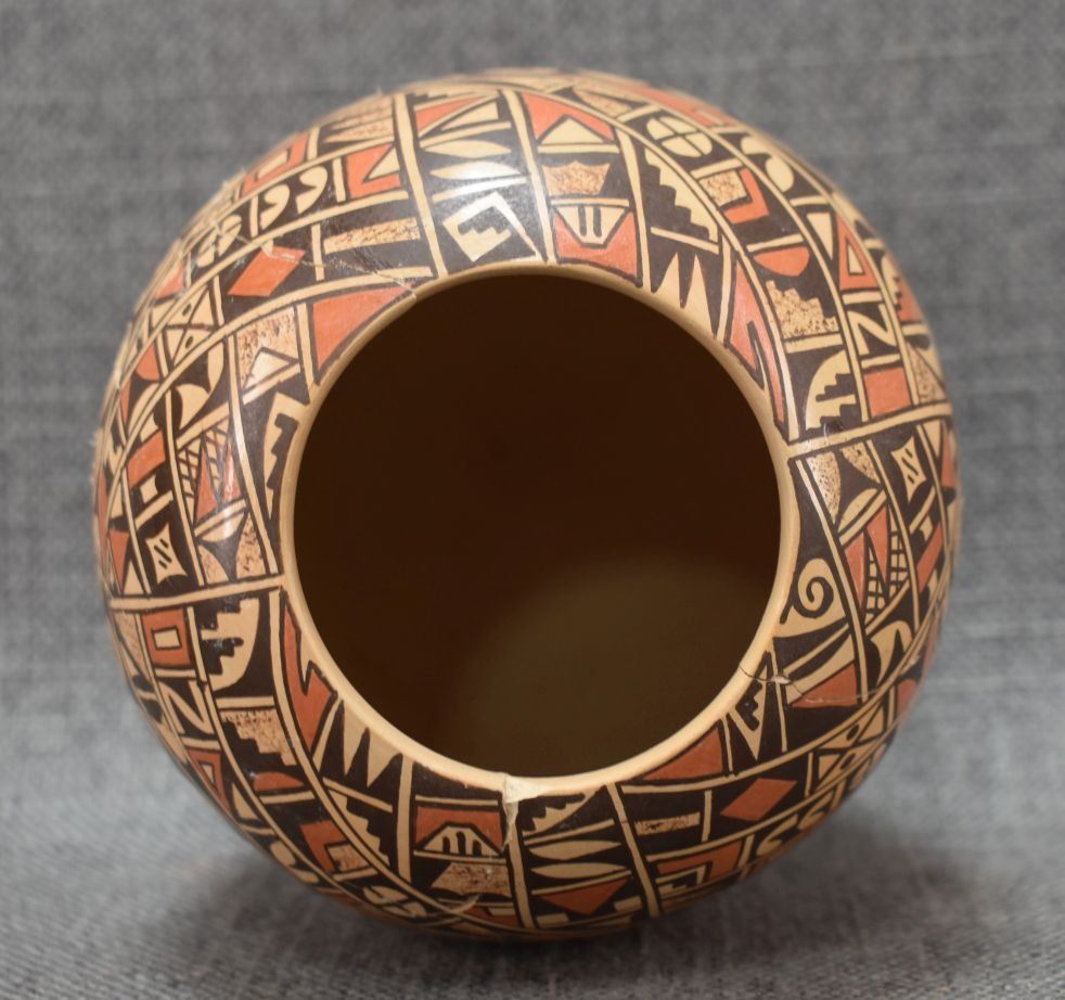 1980's Hopi Indian hand coiled and polychrome painted geometric design signed Irma David 5.25" x 4.5" has been broken and glued