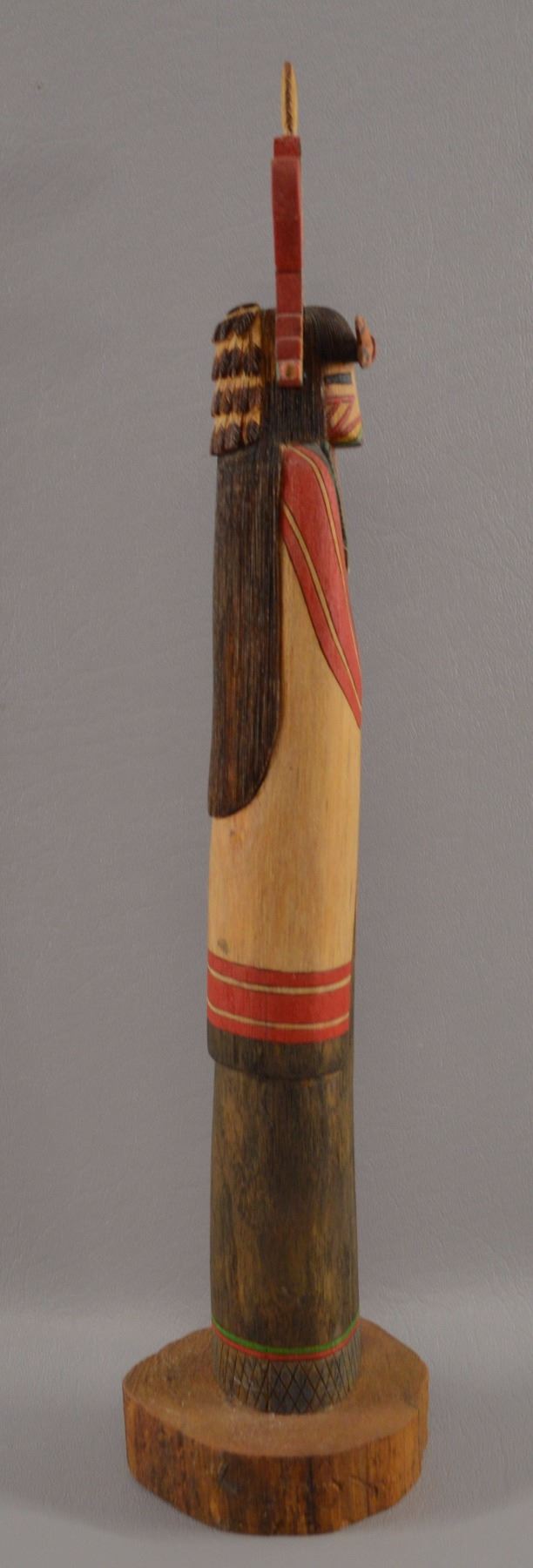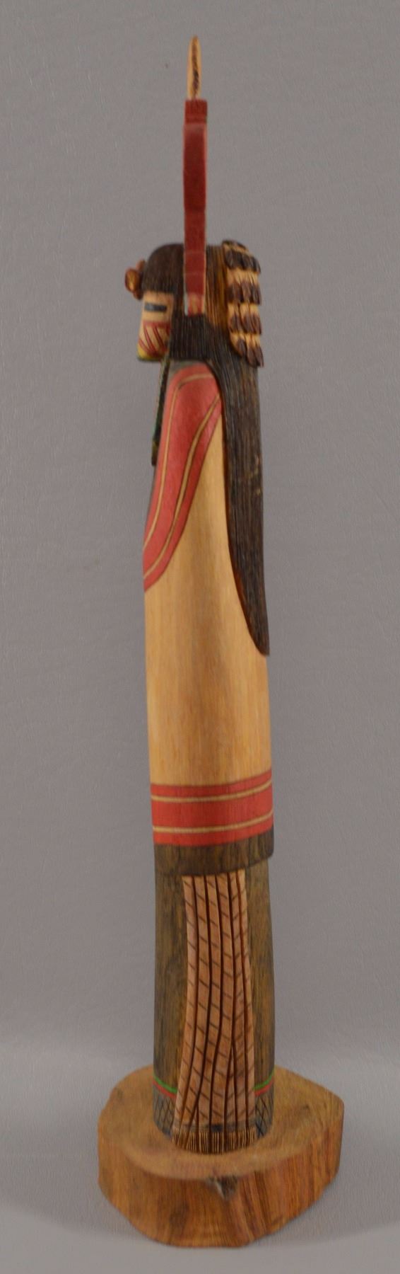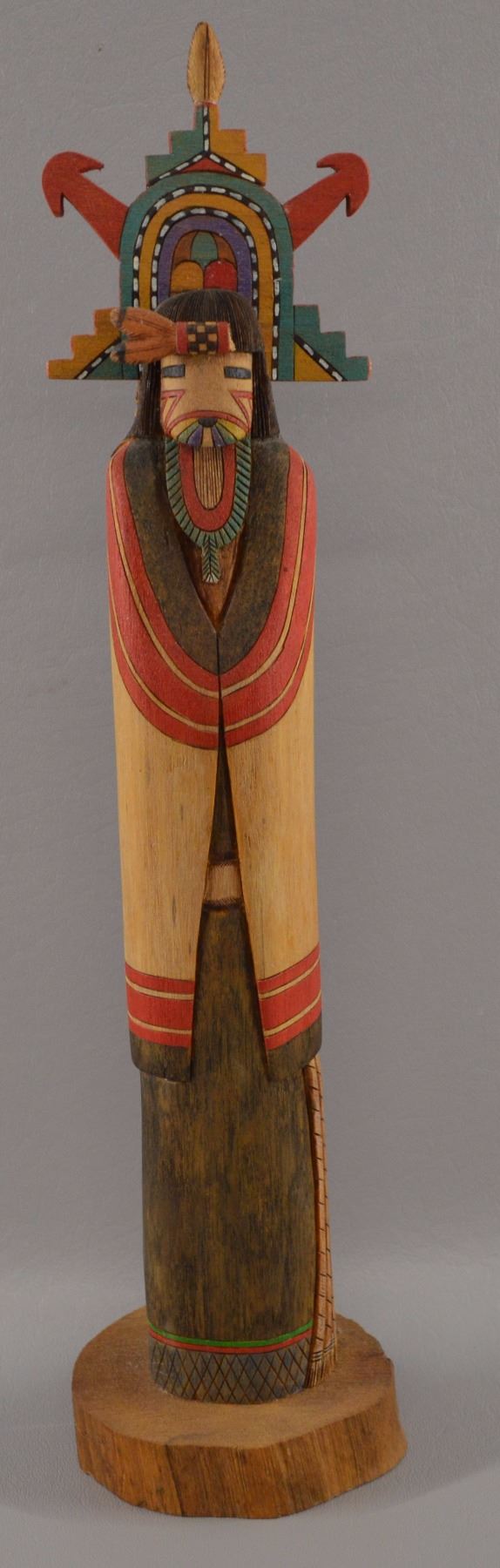 1980's. Hand carved and painted long haired kachina with tableta. has missing feather. Signed M. Bilanedy