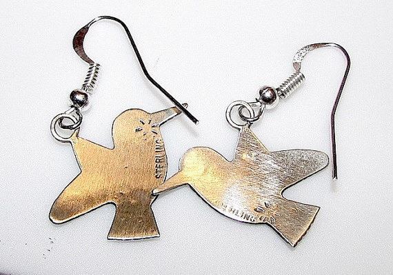 For your consideration is a pair of these wonderful vintage Native American HOPI sterling silver humming bird earrings in great condition. The earrings features an intricate and truly detailed tribal design in sterling silver in the shape of hummingbirds . The earrings measure 1 1/2" long including hooks by about 3/4" wide. The earrings are light weight and do not have a pulling feeling on the ears at all. Marked "sterling and stamped with the artist's hallmark. The hummingbird spirit animal symbolizes the enjoyment of life and lightness of being. Those who have the hummingbird as a totem are invited to enjoy the sweetness of life, lift up negativity wherever it creeps in and express love more fully in their daily endeavors. . Superb addition to any jewelry collection!