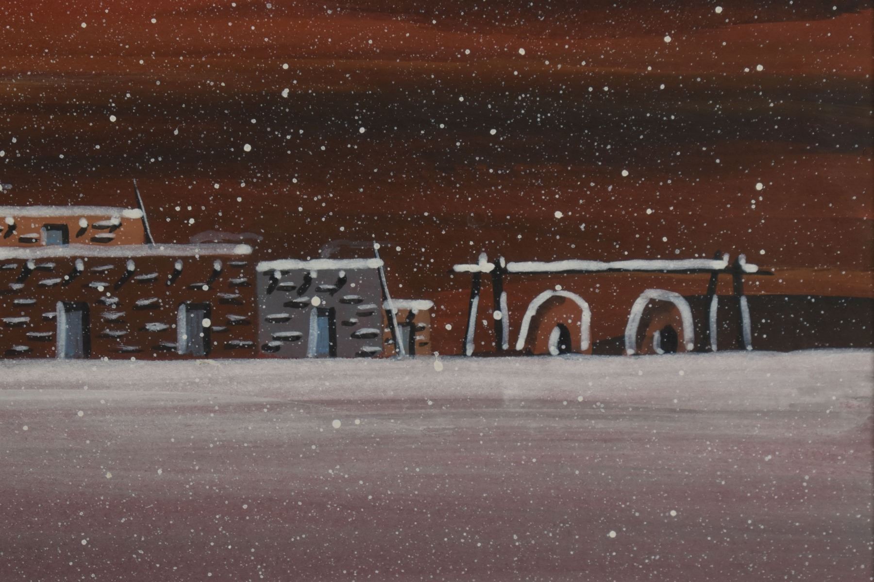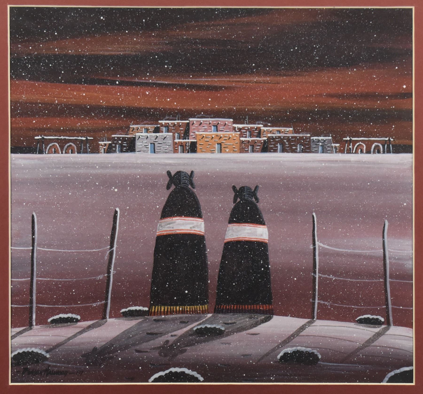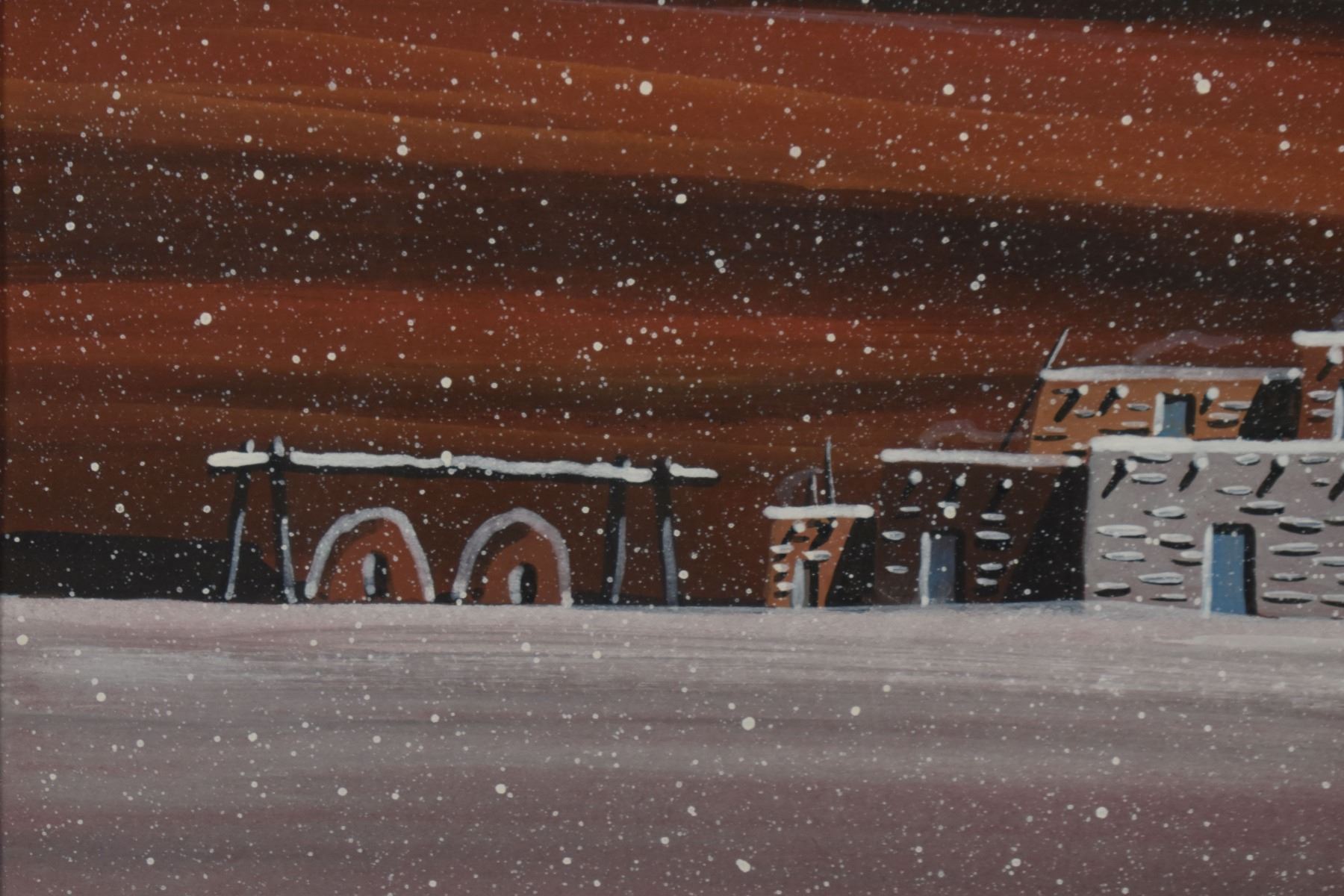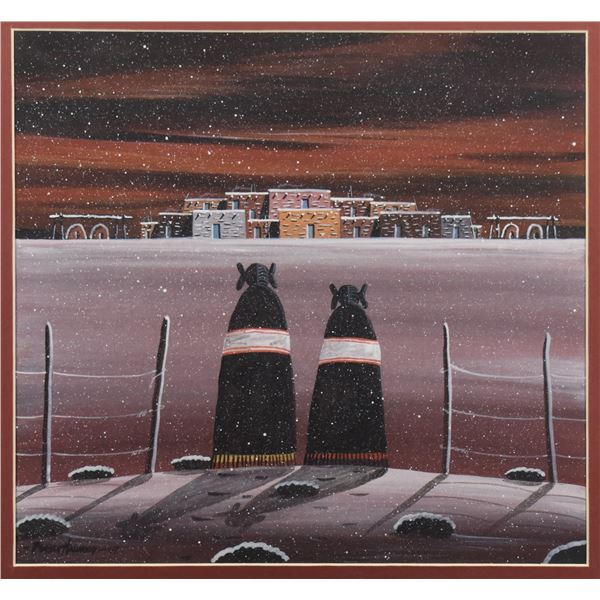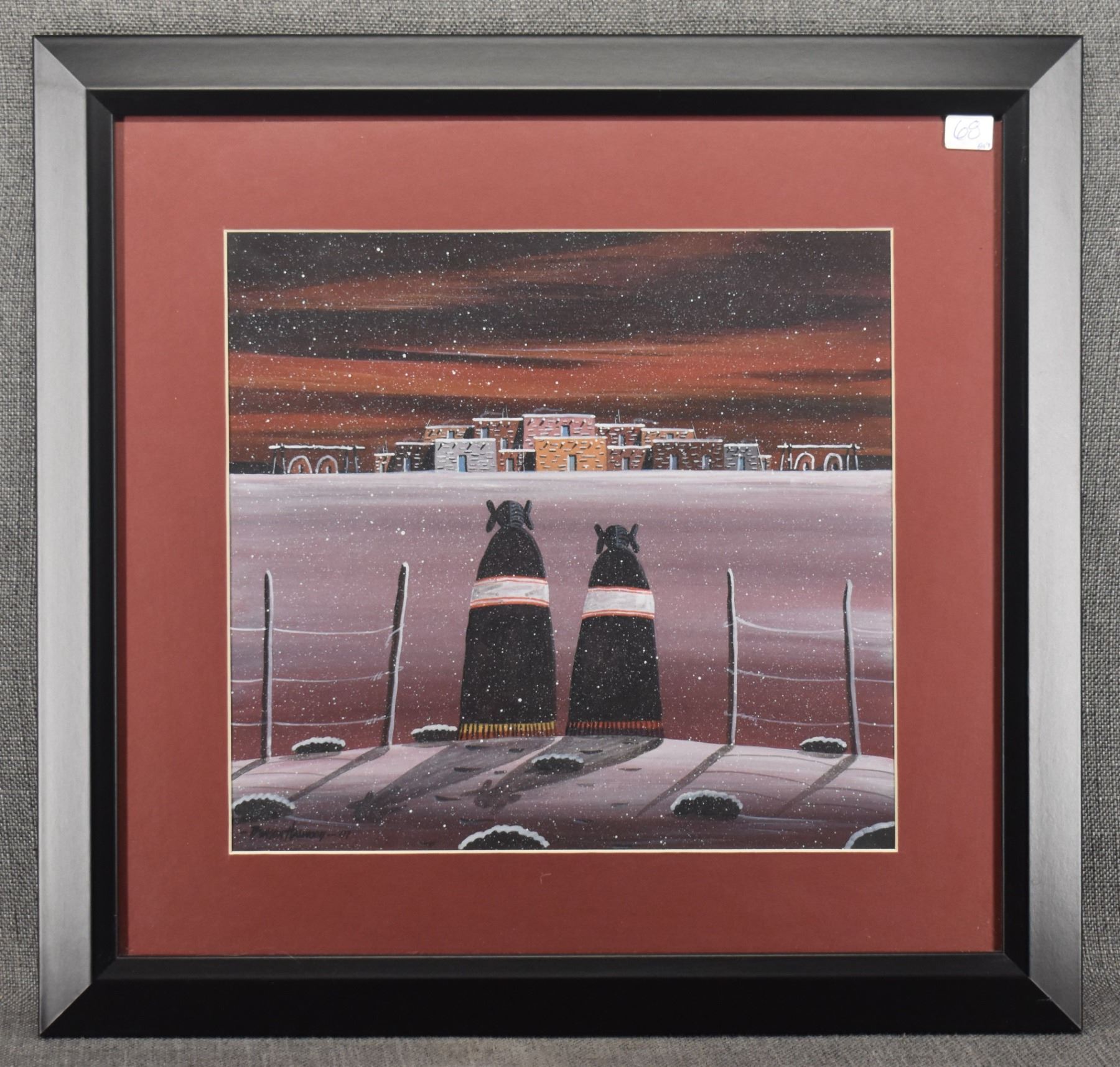 2007 Hopi. Original on paper depicting native woman and pueblo. Signed Benson Halwood. 12'' x 12'' frame size 19'' x 19''