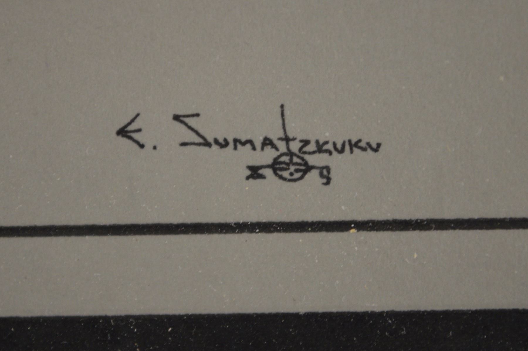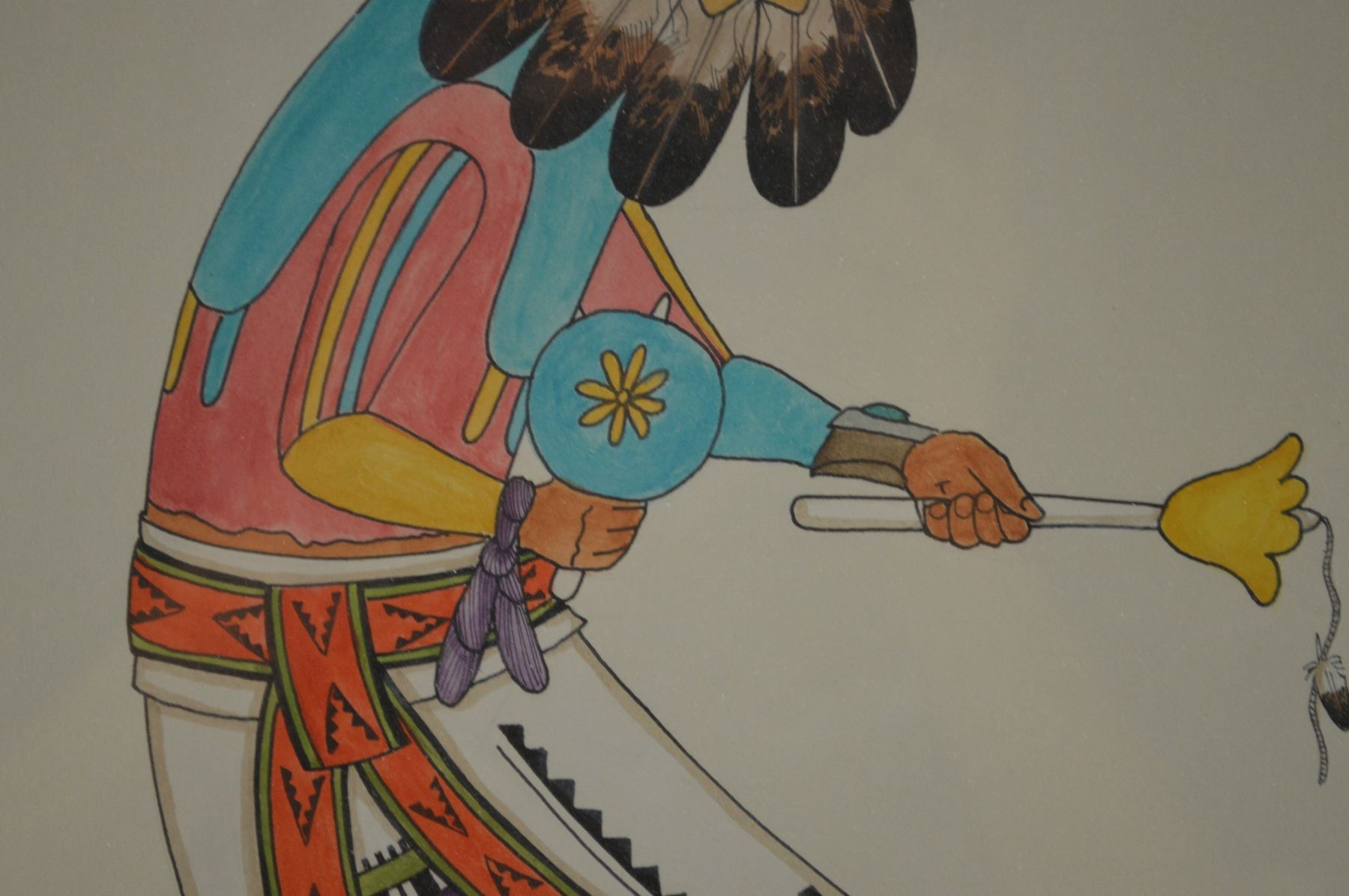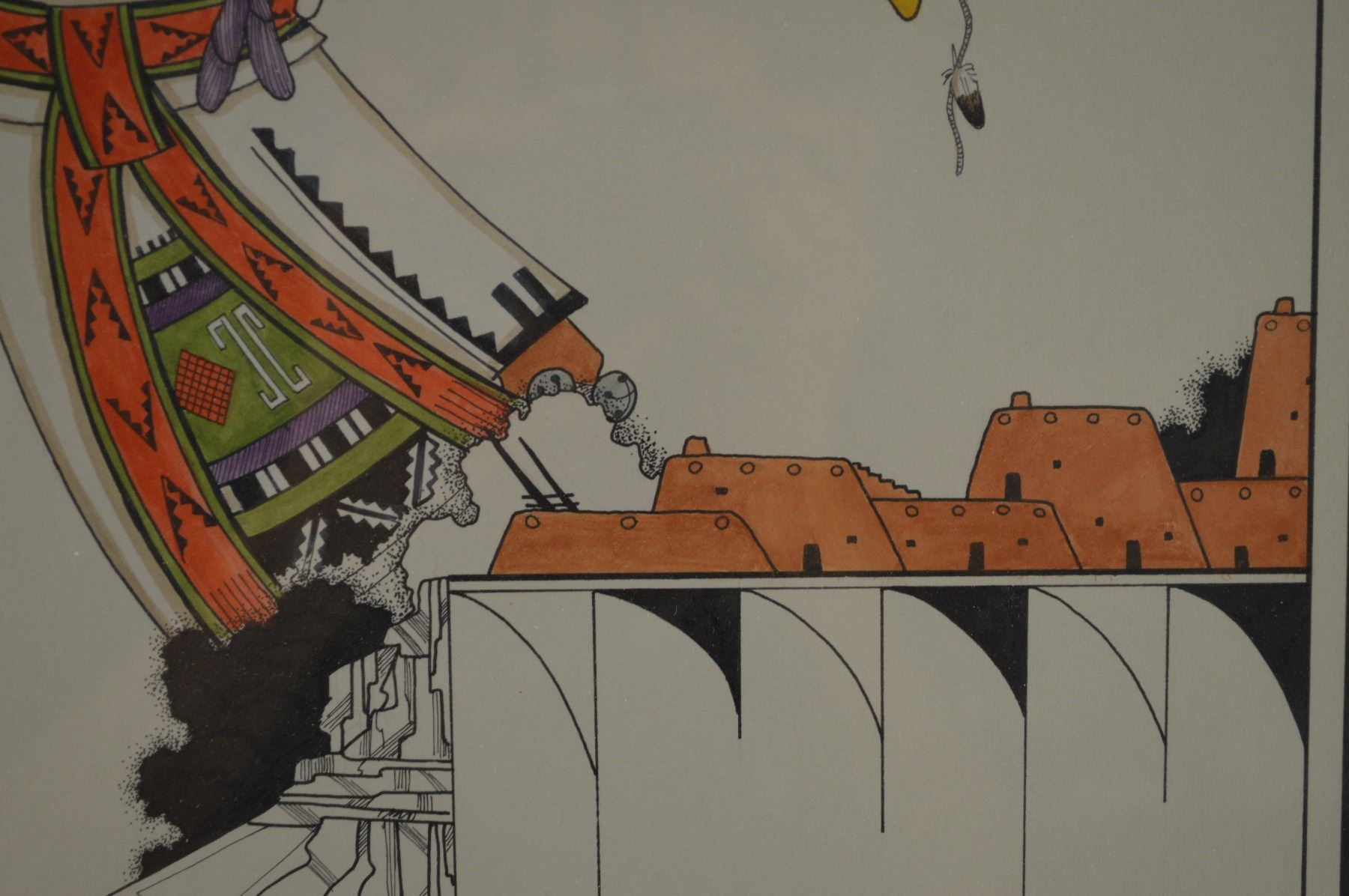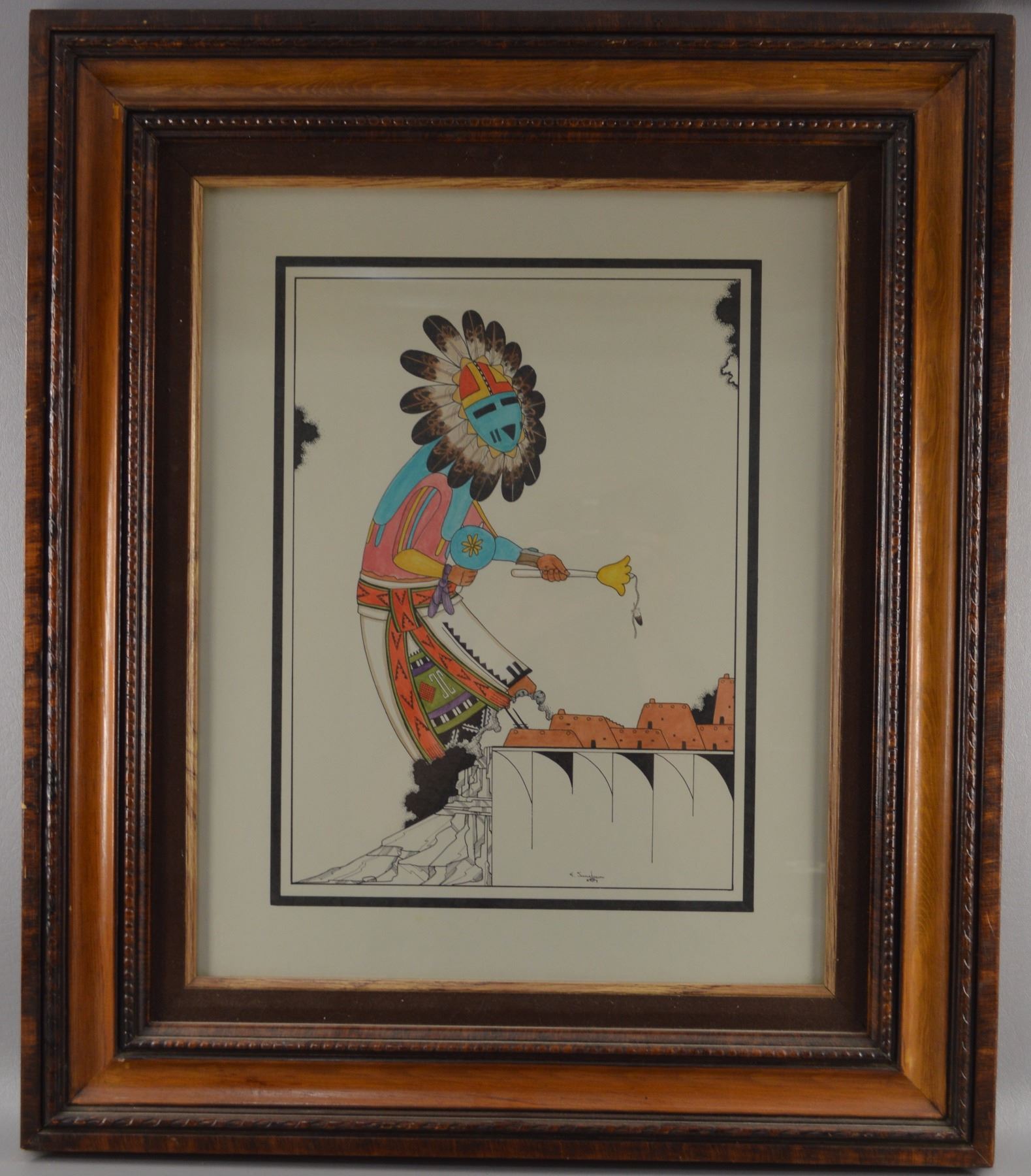 1989/ Original watercolor on paper of Kachina dancing over 1st mesa. Signed E Sumatzkuku. 16" x 12" framed to 27" x 24"