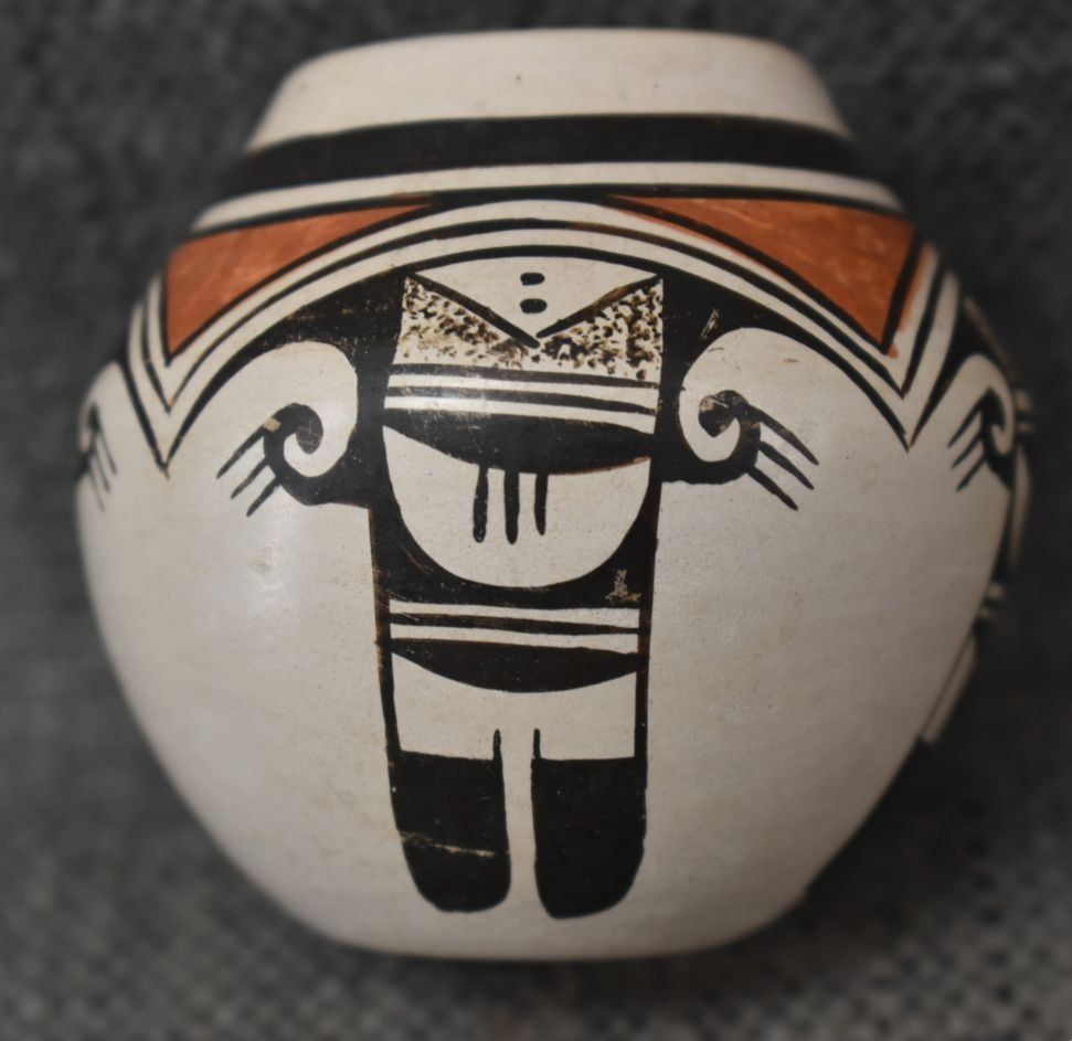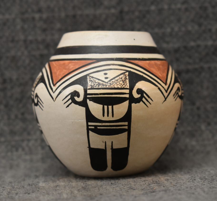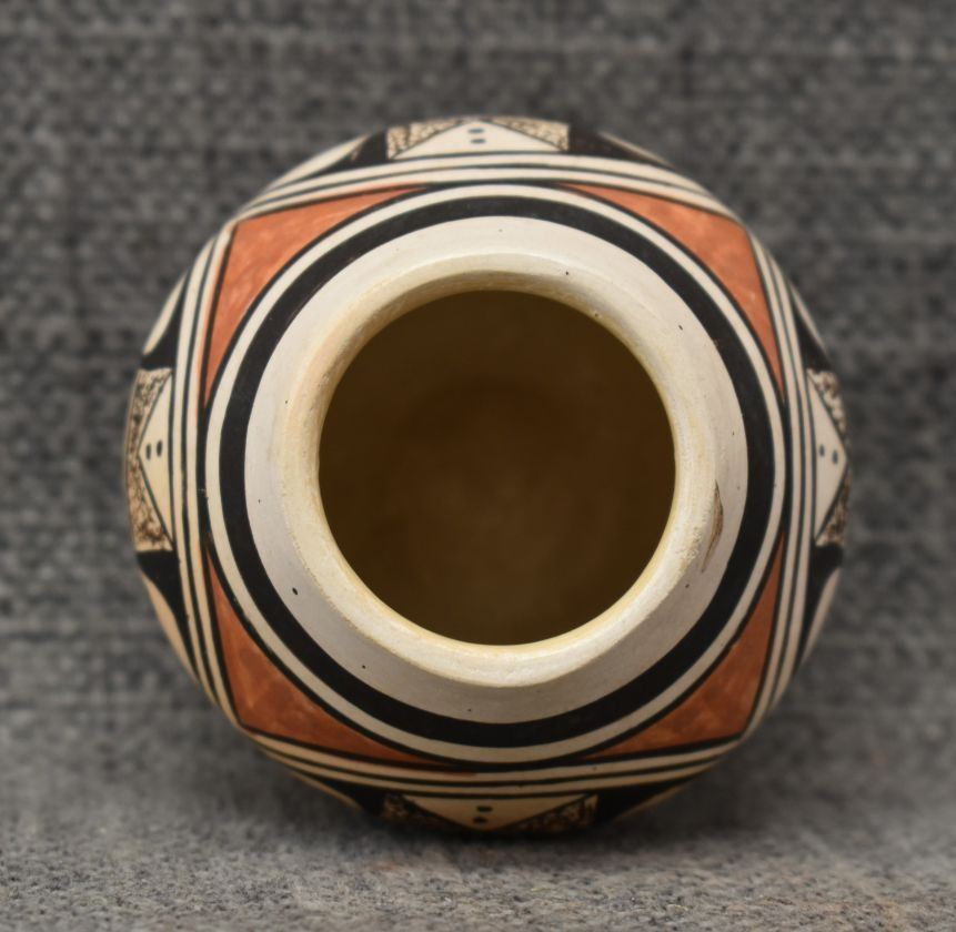 1980's Hopi, hand coiled pottery bowl with painted polychrome design signed with feather logo for Helen Naha, 2.25'' x 2.5''