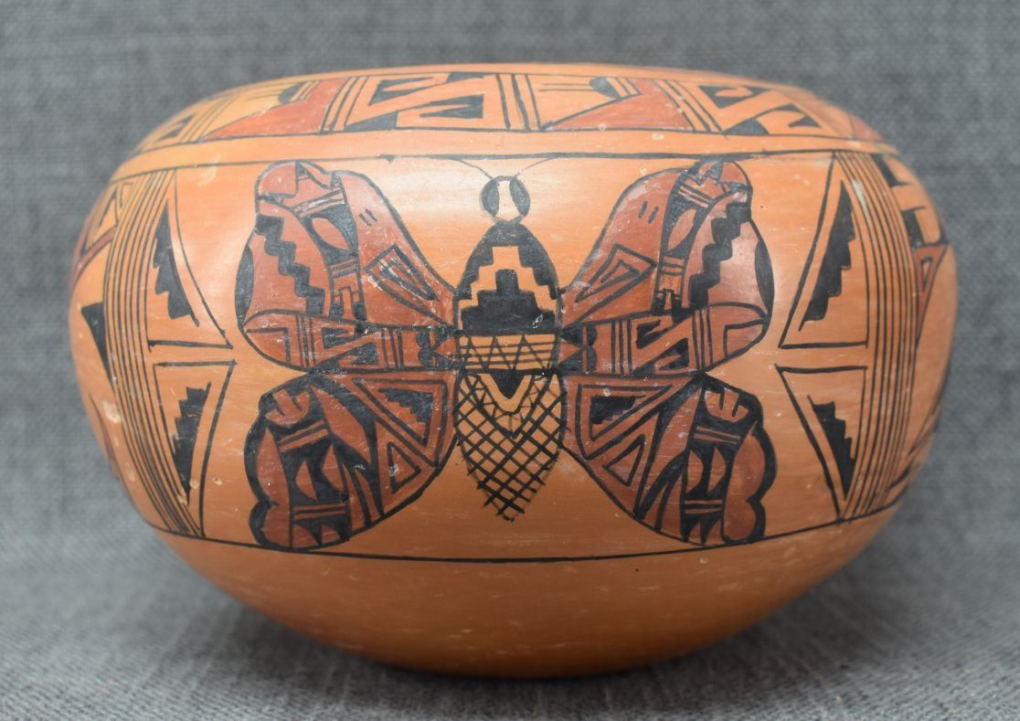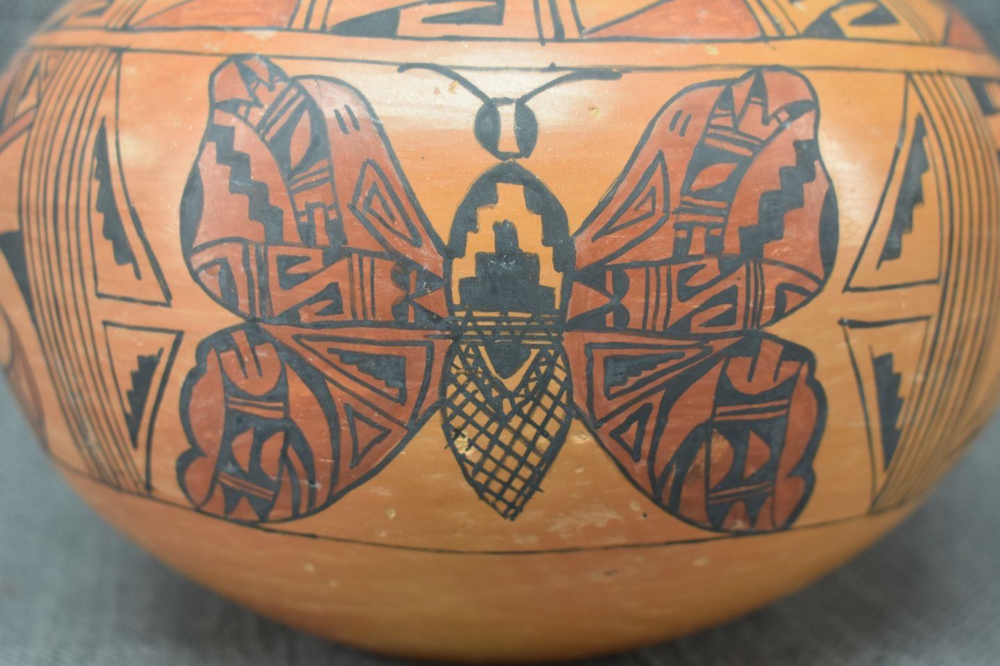 1980-90's Hopi, hand coiled with polychrome painted butterfly and geometric design 4.75" x 7.75"