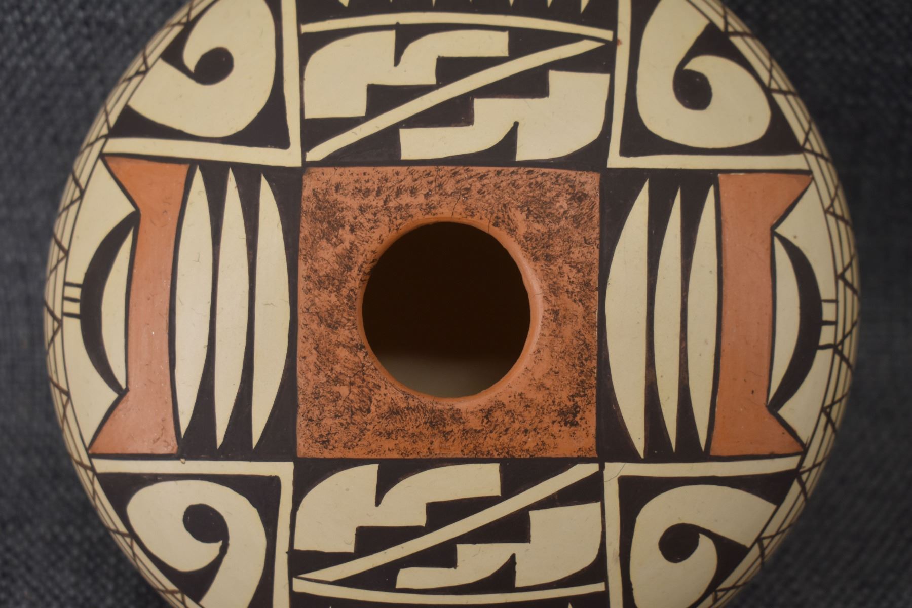 1980-90's Hopi, hand coiled with polychrome painted design signed V Dewakuku 3" x 5.5"