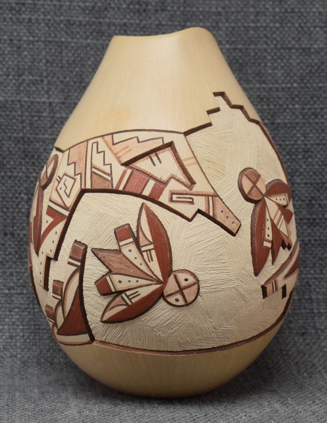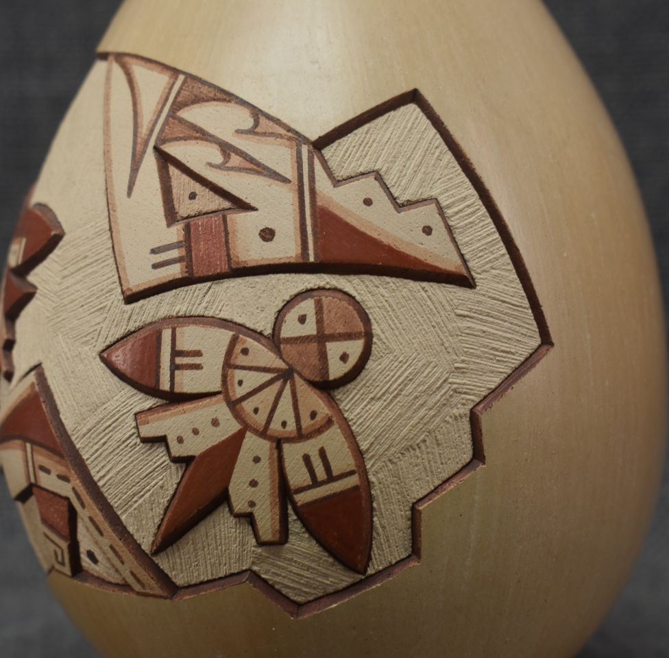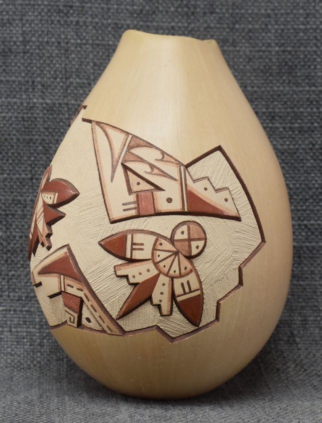 1980-90's Hopi, hand coiled with carved and painted insect and geometric designs signed Loren H Nampeyo 5.5" x 4"