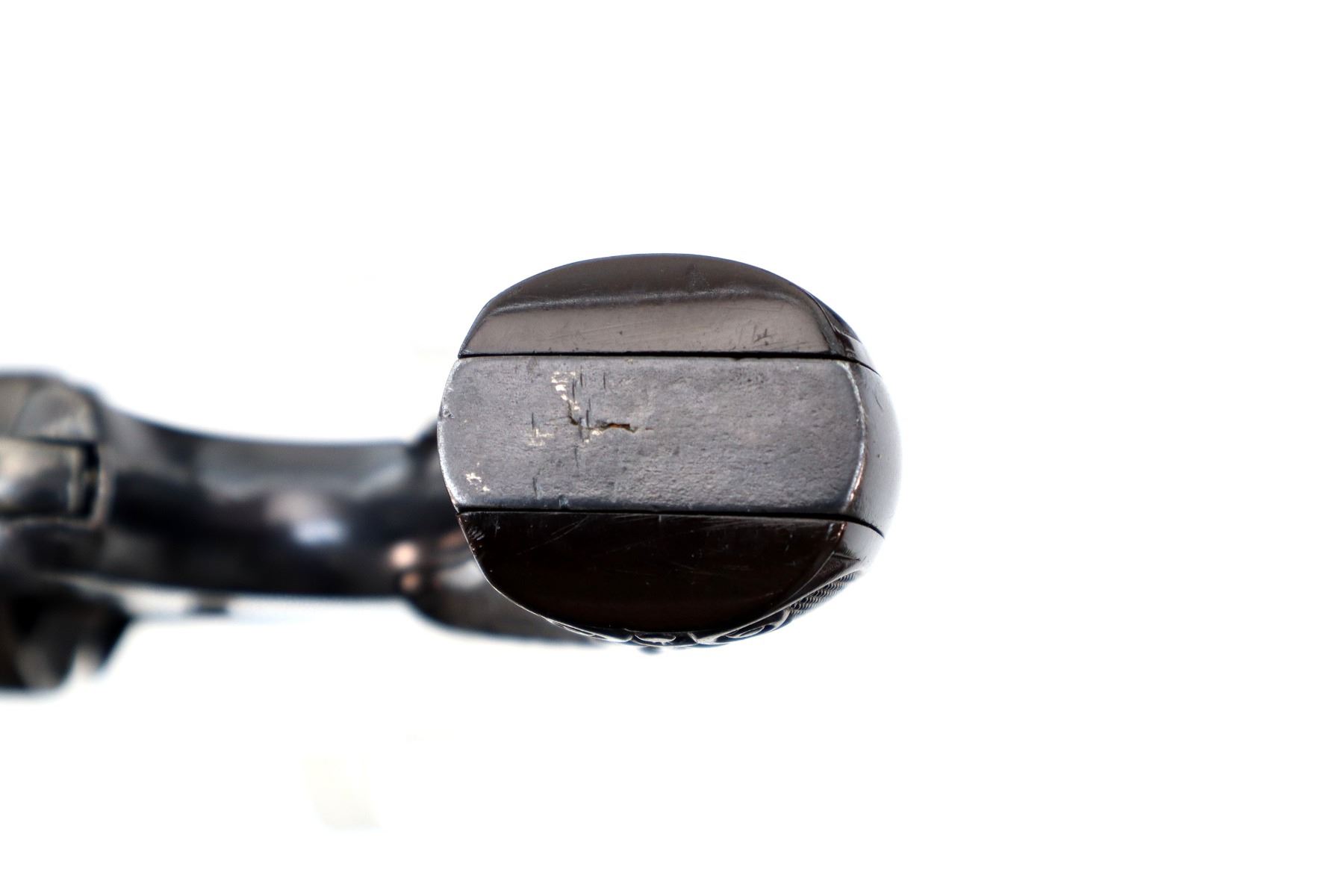 Main Description: Consignor states: The date May 27, 79 on this revolver refers to George W. Cilley's Patent no 215,721. Functions mechanically as designed, Hammer does not stay cocked. Blade front sight, metal has been reblued with pitting underneath, smooth cylinder, checkered spur hammer and smooth trigger. Two piece checkered brown polymer grips, damaged cylinder pin.