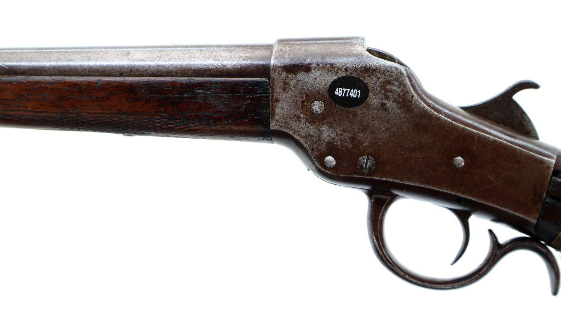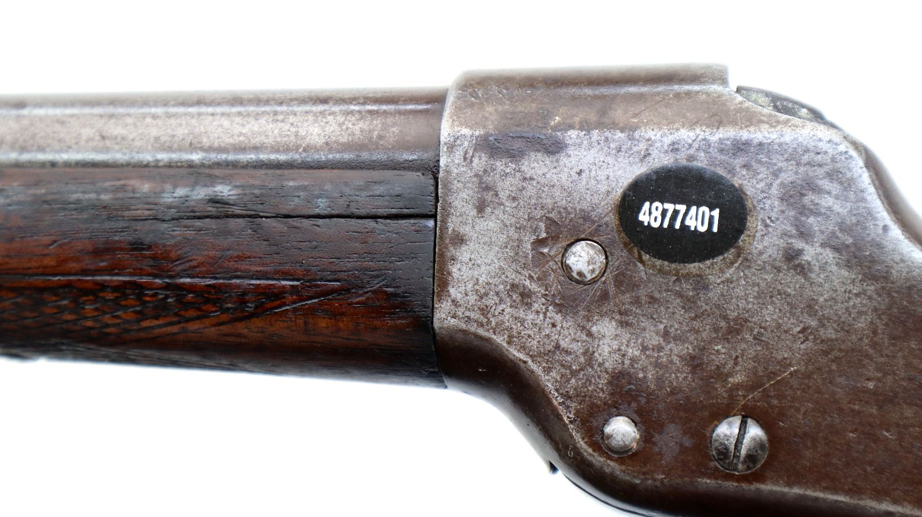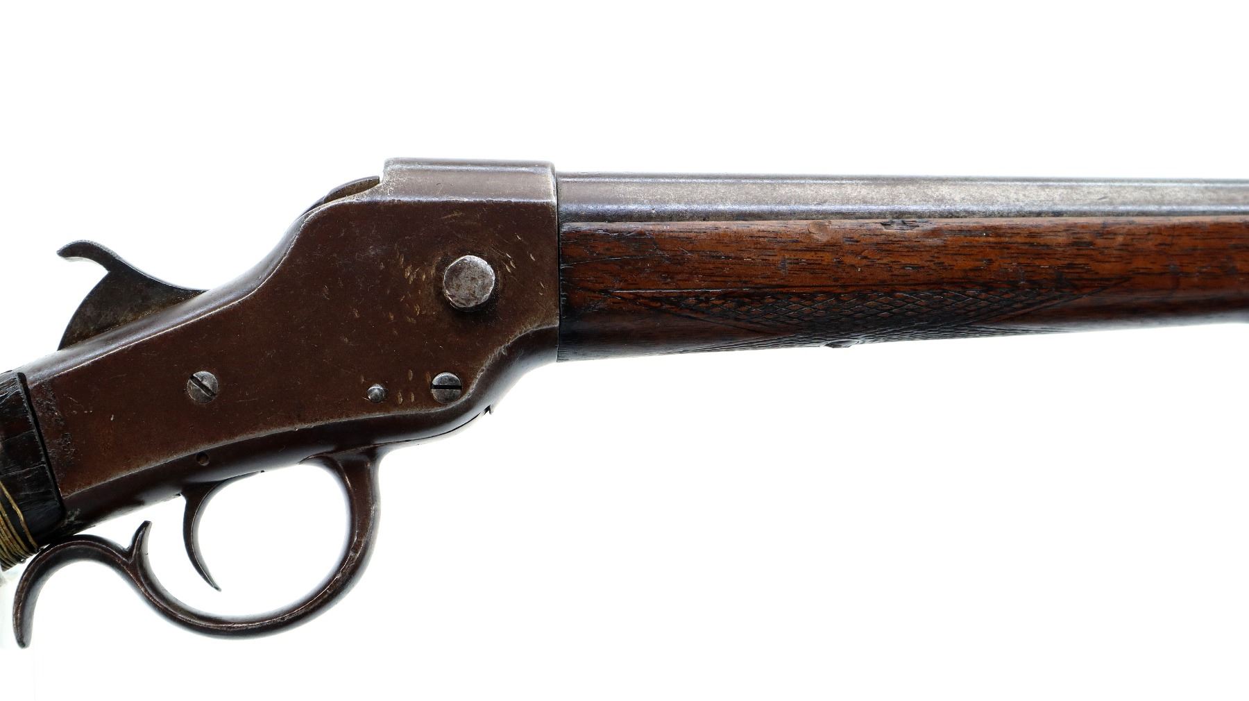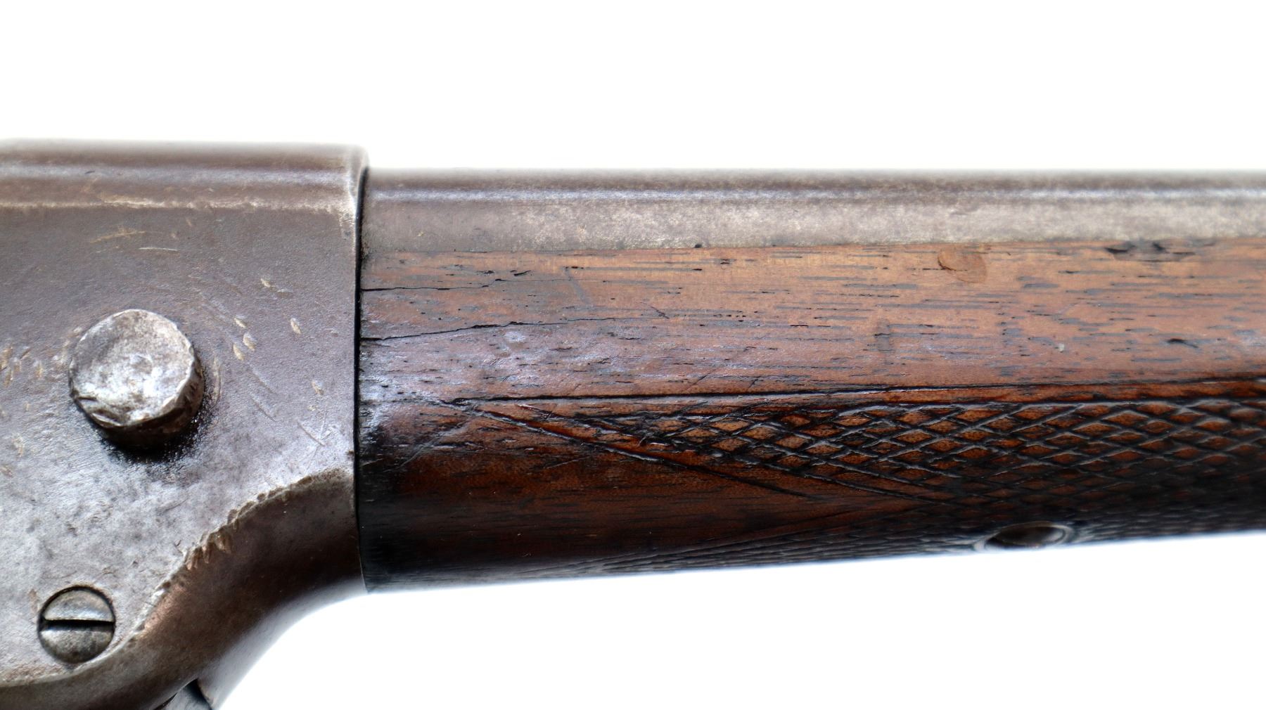 Main Description: Brass bead, round barrel, checkered spur hammer, extractor is present. Two piece wood stocks, checkered forearm which is cracked, pistol grip chipped cracked and broken repaired with nails and brass wire, checkered black polymer butt plate which is chipped and broken, stock chipped at toe. Missing take down ring