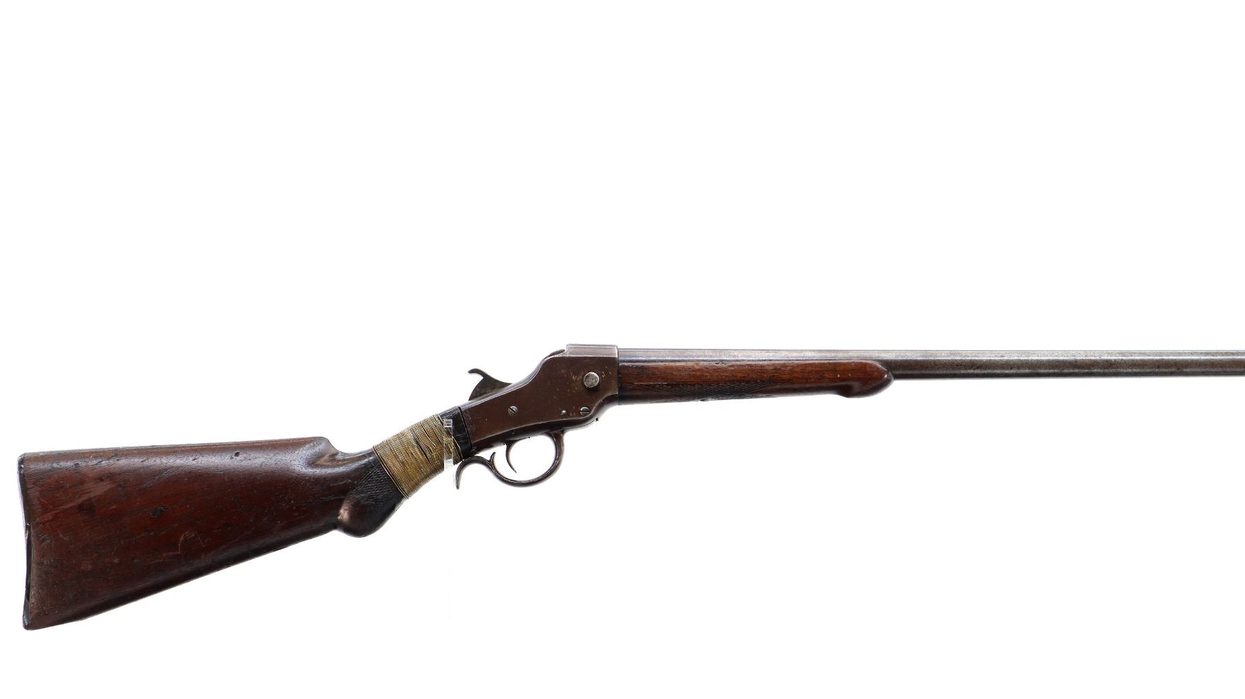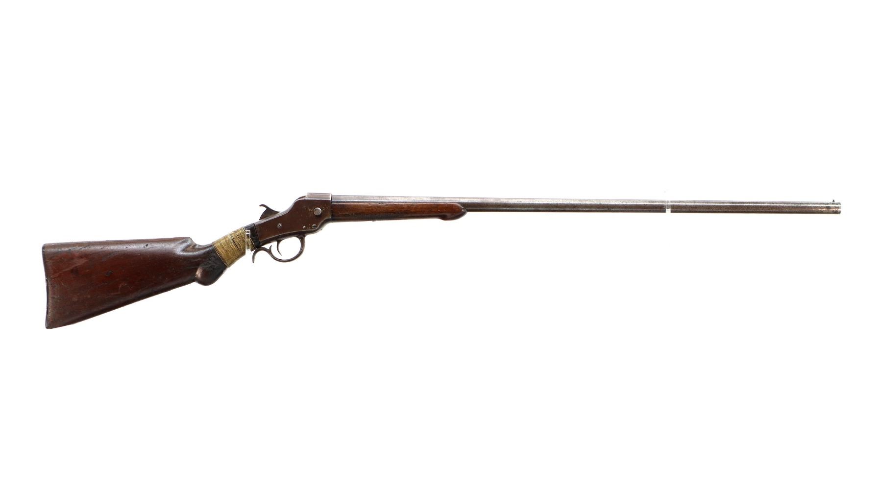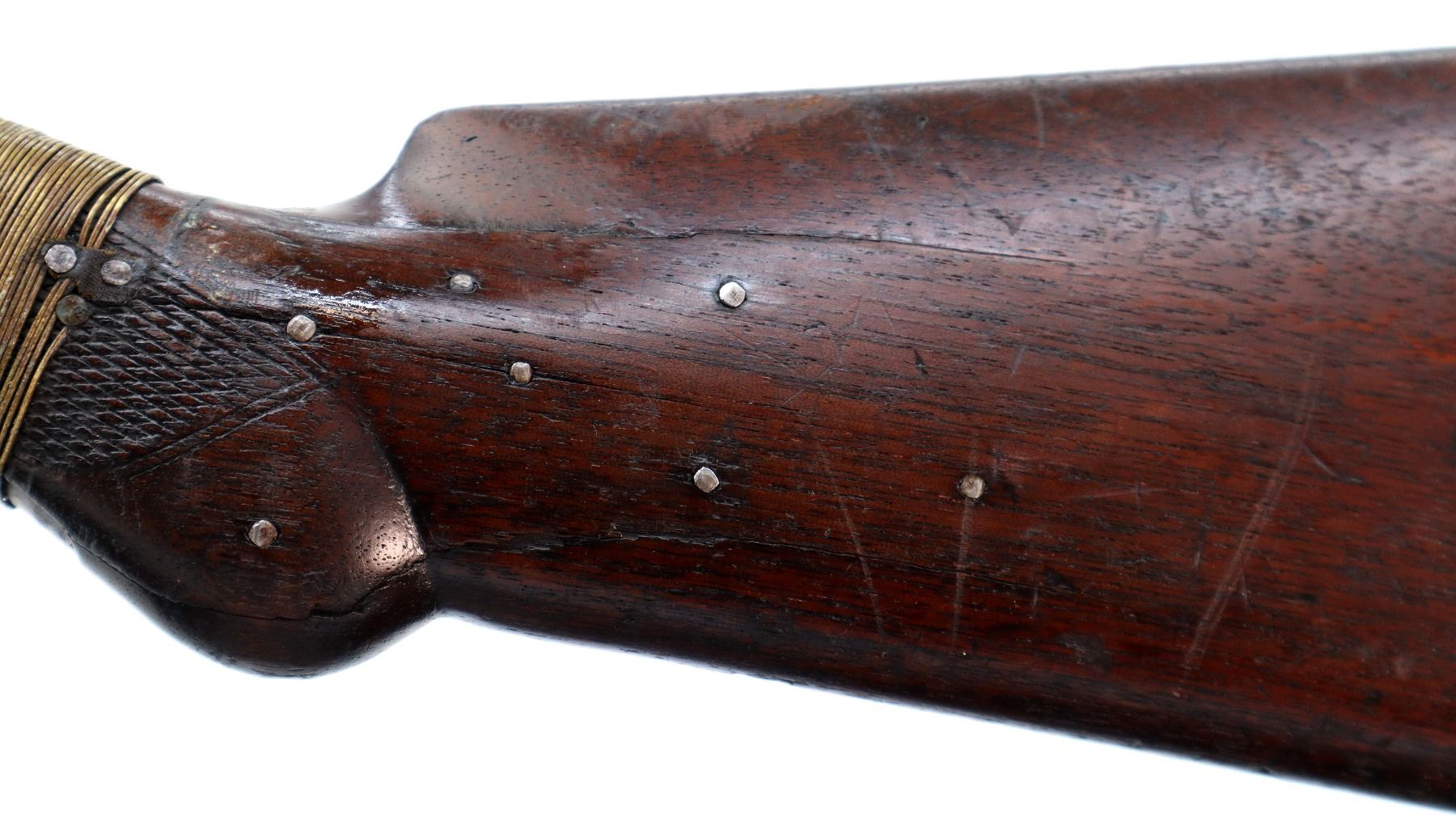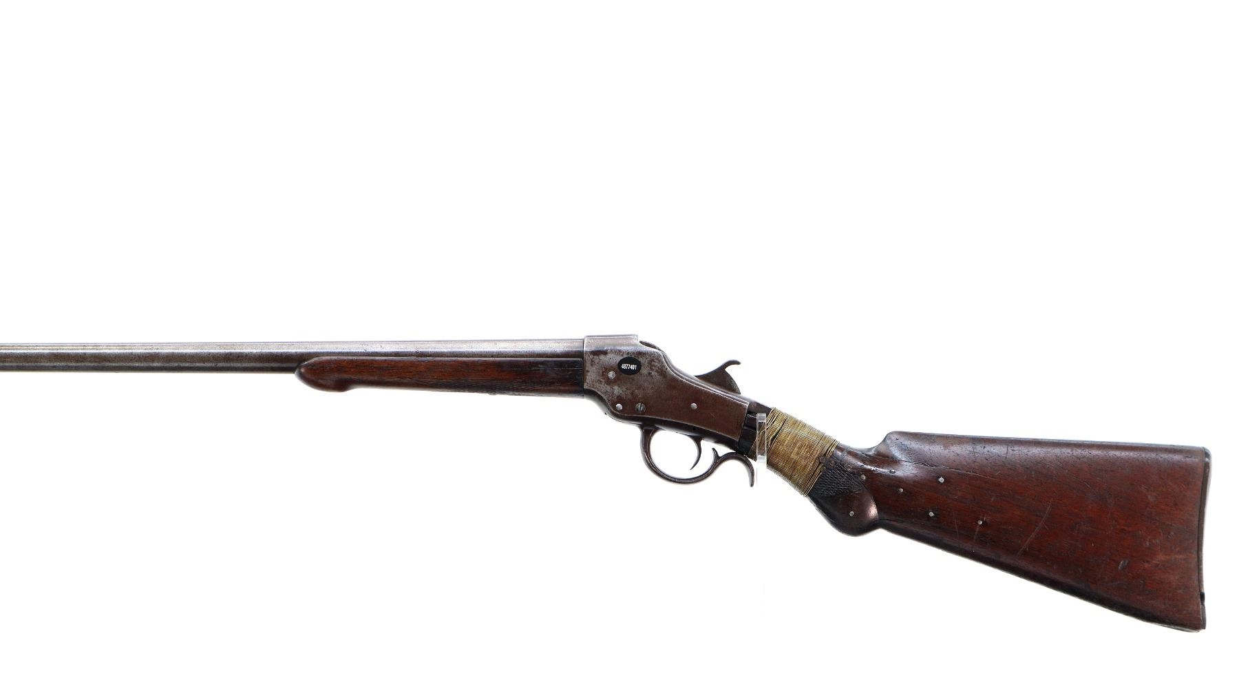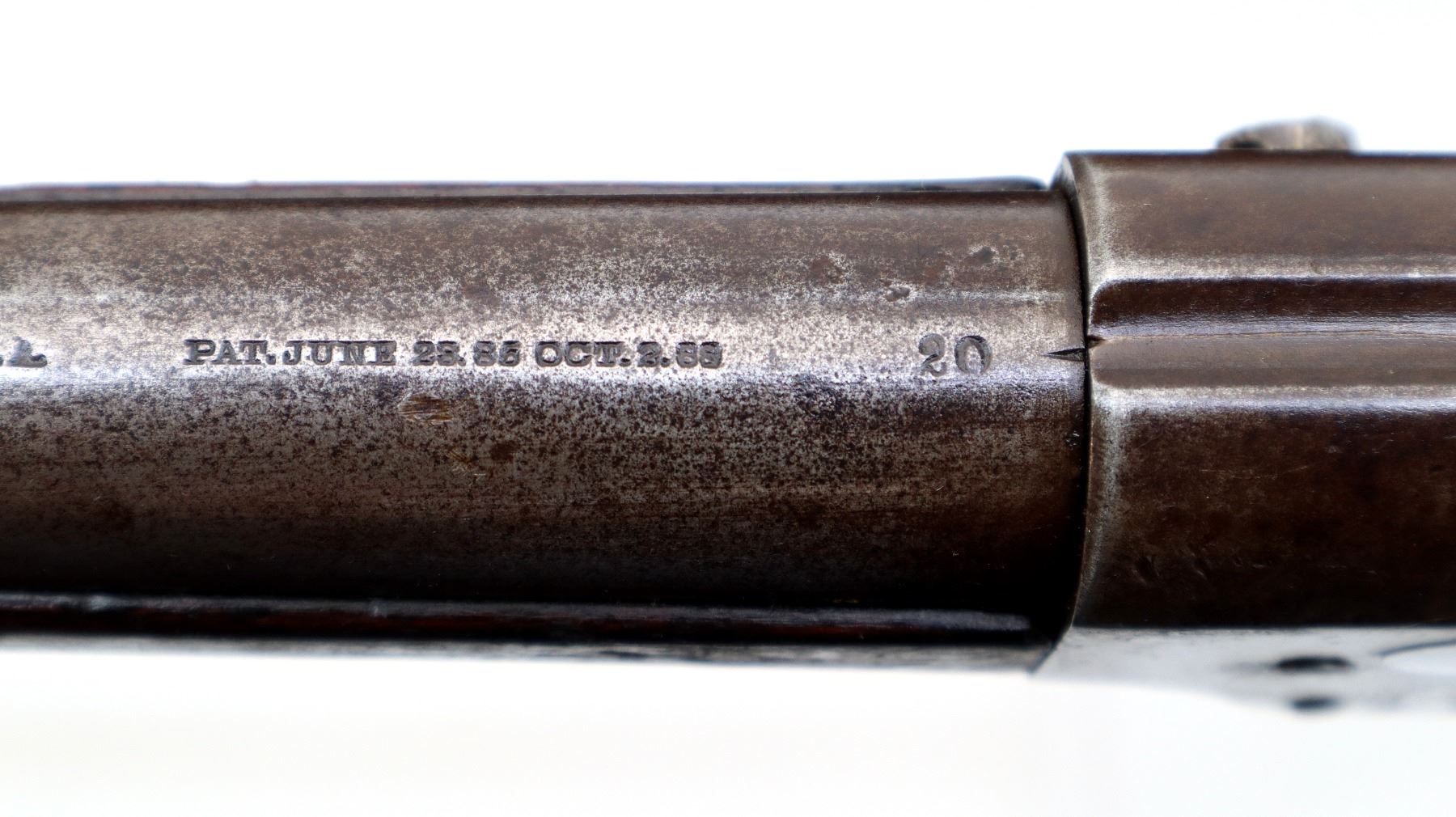 Main Description: Brass bead, round barrel, checkered spur hammer, extractor is present. Two piece wood stocks, checkered forearm which is cracked, pistol grip chipped cracked and broken repaired with nails and brass wire, checkered black polymer butt plate which is chipped and broken, stock chipped at toe. Missing take down ring