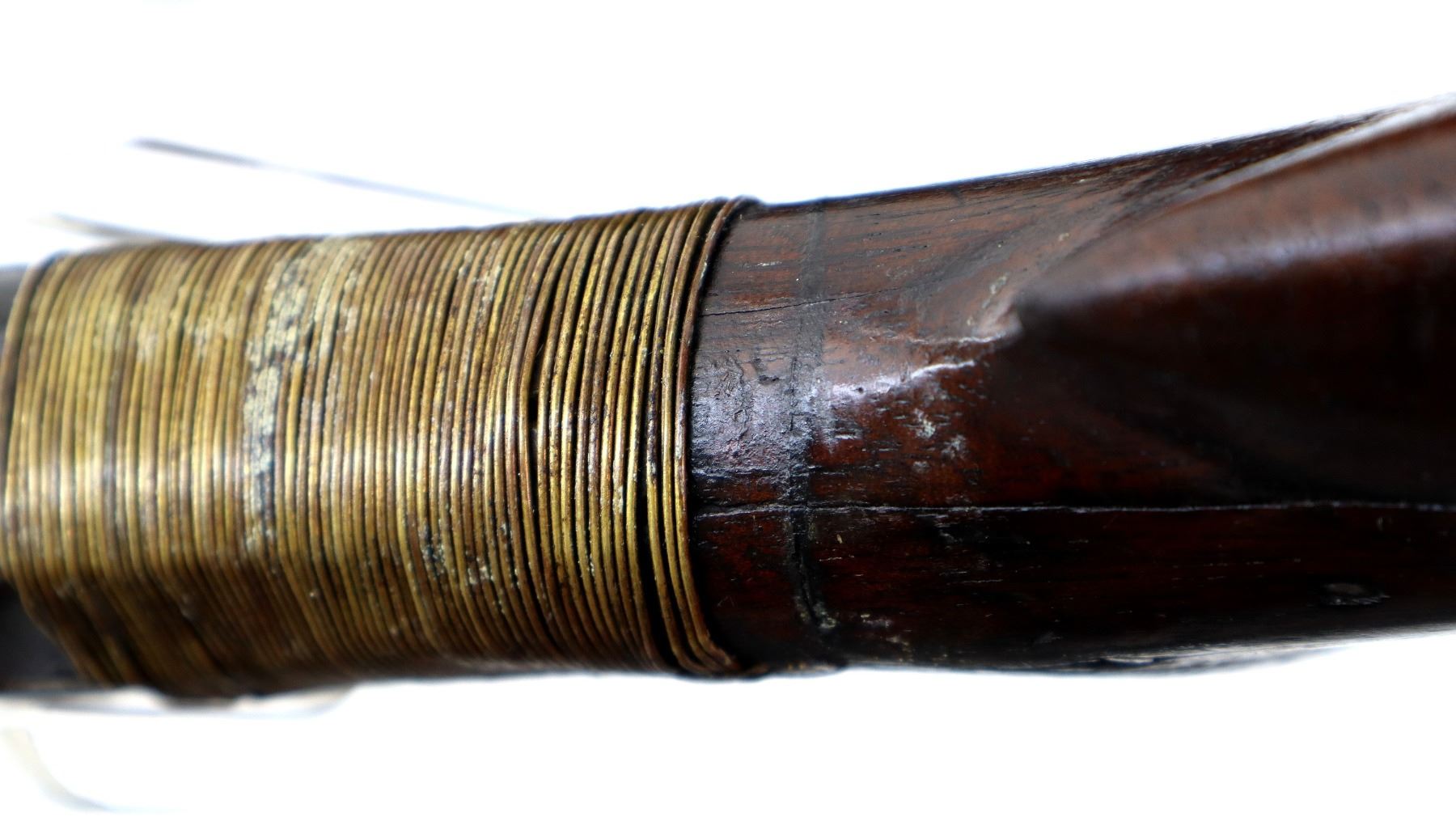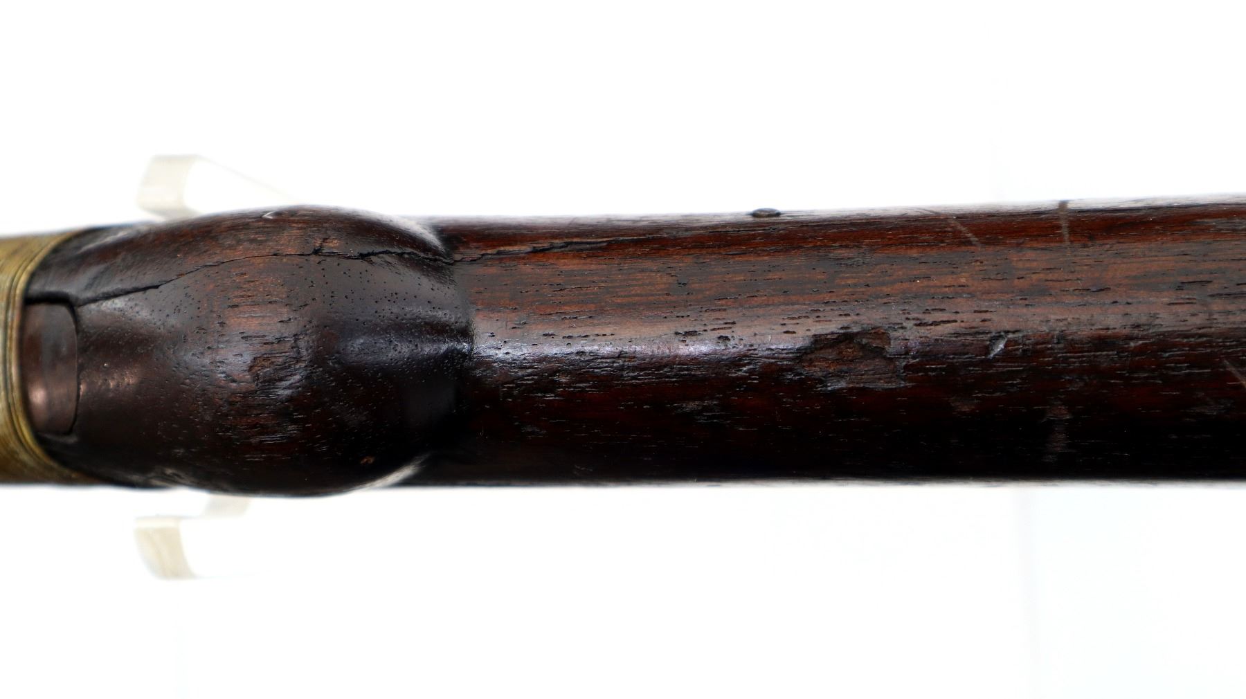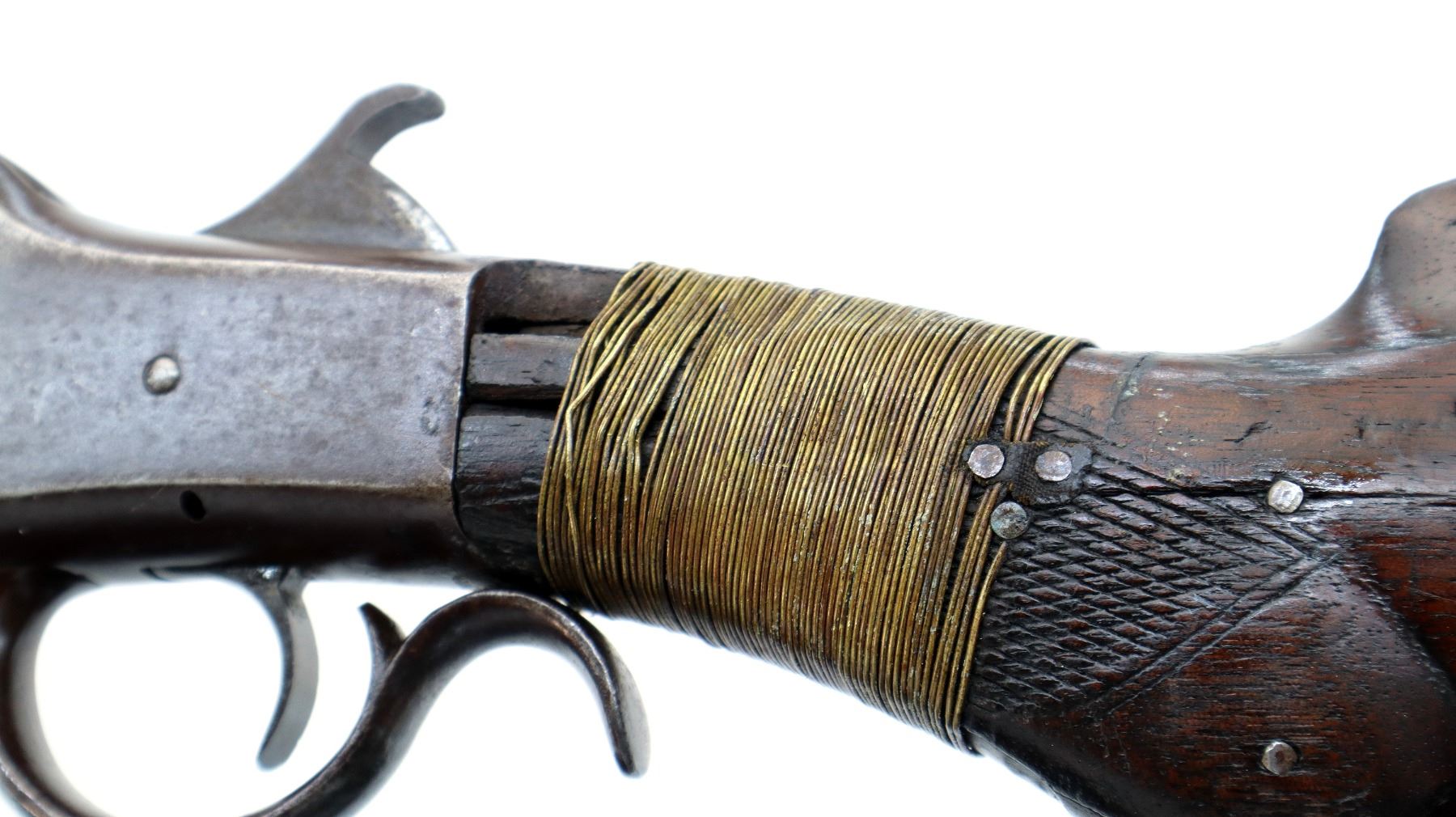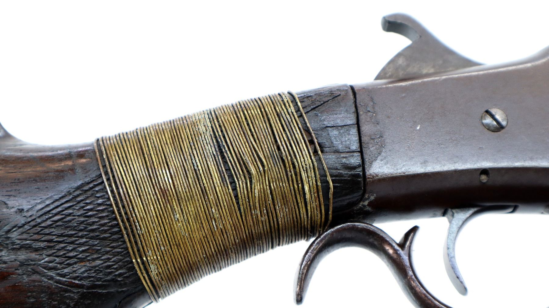 Main Description: Brass bead, round barrel, checkered spur hammer, extractor is present. Two piece wood stocks, checkered forearm which is cracked, pistol grip chipped cracked and broken repaired with nails and brass wire, checkered black polymer butt plate which is chipped and broken, stock chipped at toe. Missing take down ring
