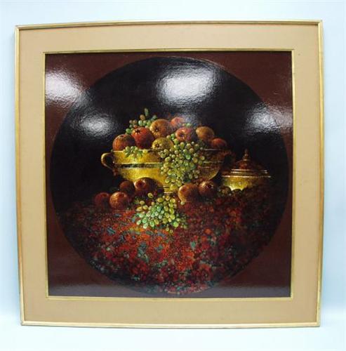HORATIO BLAS MAZZA - Important 20th Century Latin-American school. "Naturaleza muerta dorada." A large mixed media composition on panel. Signed and dated '85, lower center. Titled, signed and dated on reverse. 35" x 35". In gilt frame.