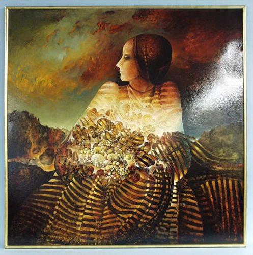 HORATIO BLAS MAZZA - Important 20th century Latin American school. "La Creacion de la Mujer." A large mixed media composition on panel. Signed and dated 88, lower right. Titled, signed and dated on reverse. 48" x 48". In gilt frame.