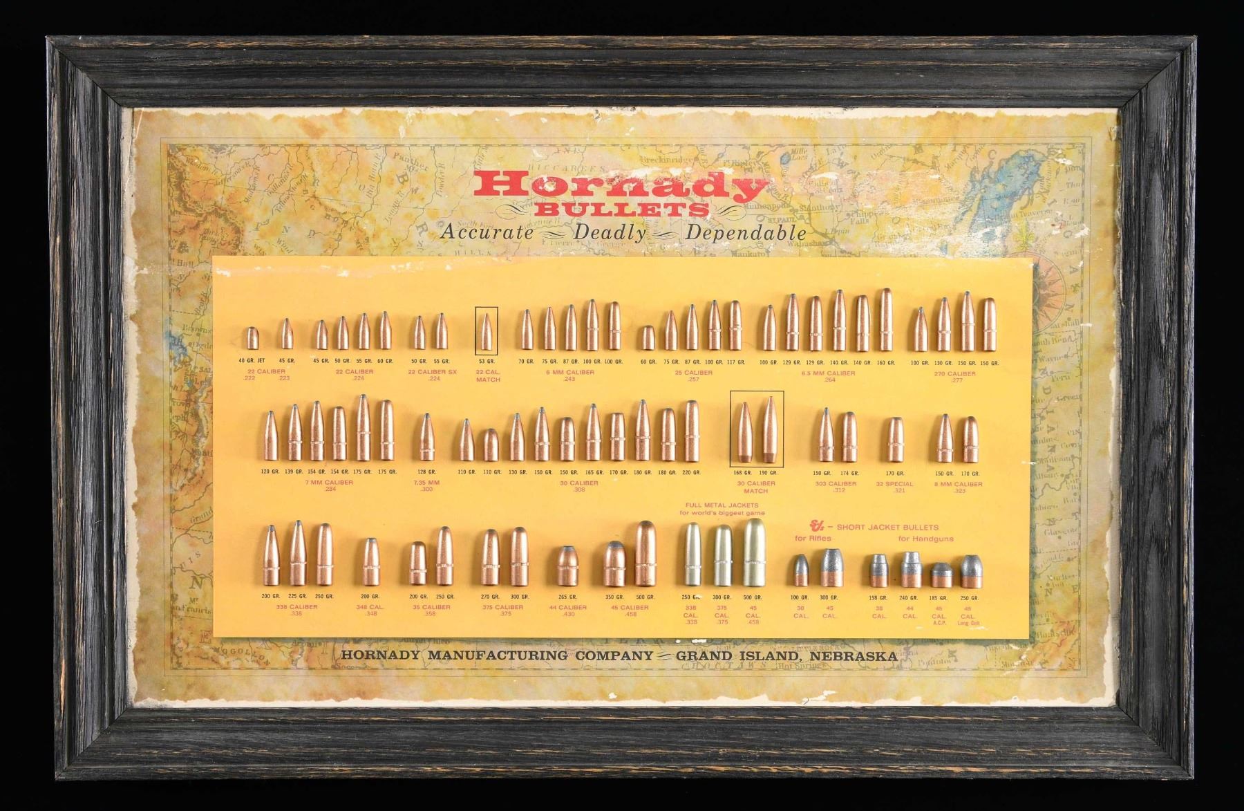 Bullet board produced by Hornady display a variety of projectiles ranging from .22 Caliber to .45 Caliber. Top fo the board is marked "Hornady/ BULLETS/ Accurate - Deadly - Dependable", with "HORNADY MANUFACTURING COMPANY - GRAND ISLAND, NEBRASKA" on the bottom. Board measures 22 1/4" in length and 14 1/2" in height. CONDITION: good, with all projectiles remaining present, with some exhibiting some adhesive. Board shows some spots of wear to its map background, but otherwise presents nicely. (02-24301/MLW). NON-GUN. $200-300.