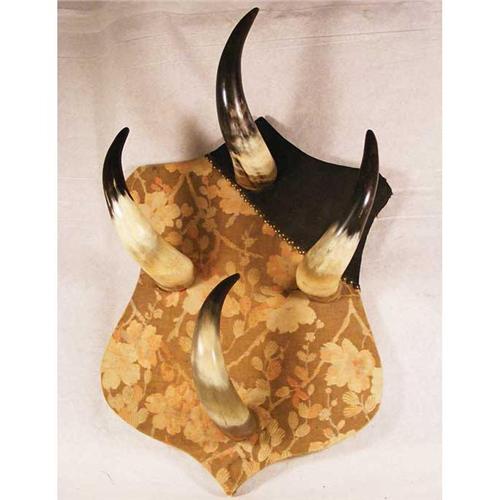 Coat Rack : Shield shaped wall mounted coat rack with stretched fabric, brass tacks and four horns.