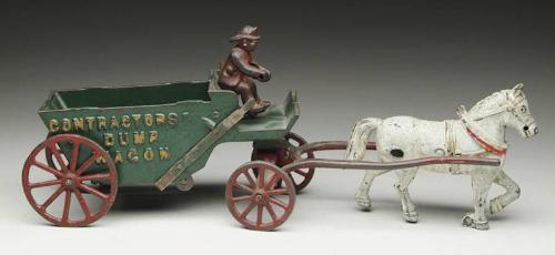 HORSE DRAWN CONTRACTORS DUMP WAGON. A contractors green dump wagon and when lever is open bottom of dump truck opens. Has red wheels and white horse. SIZE: 15" l. CONDITION: Wagon has wrong figure, some chipping and wear to horse and wagon. Overall good condition. 1-5831 MC
