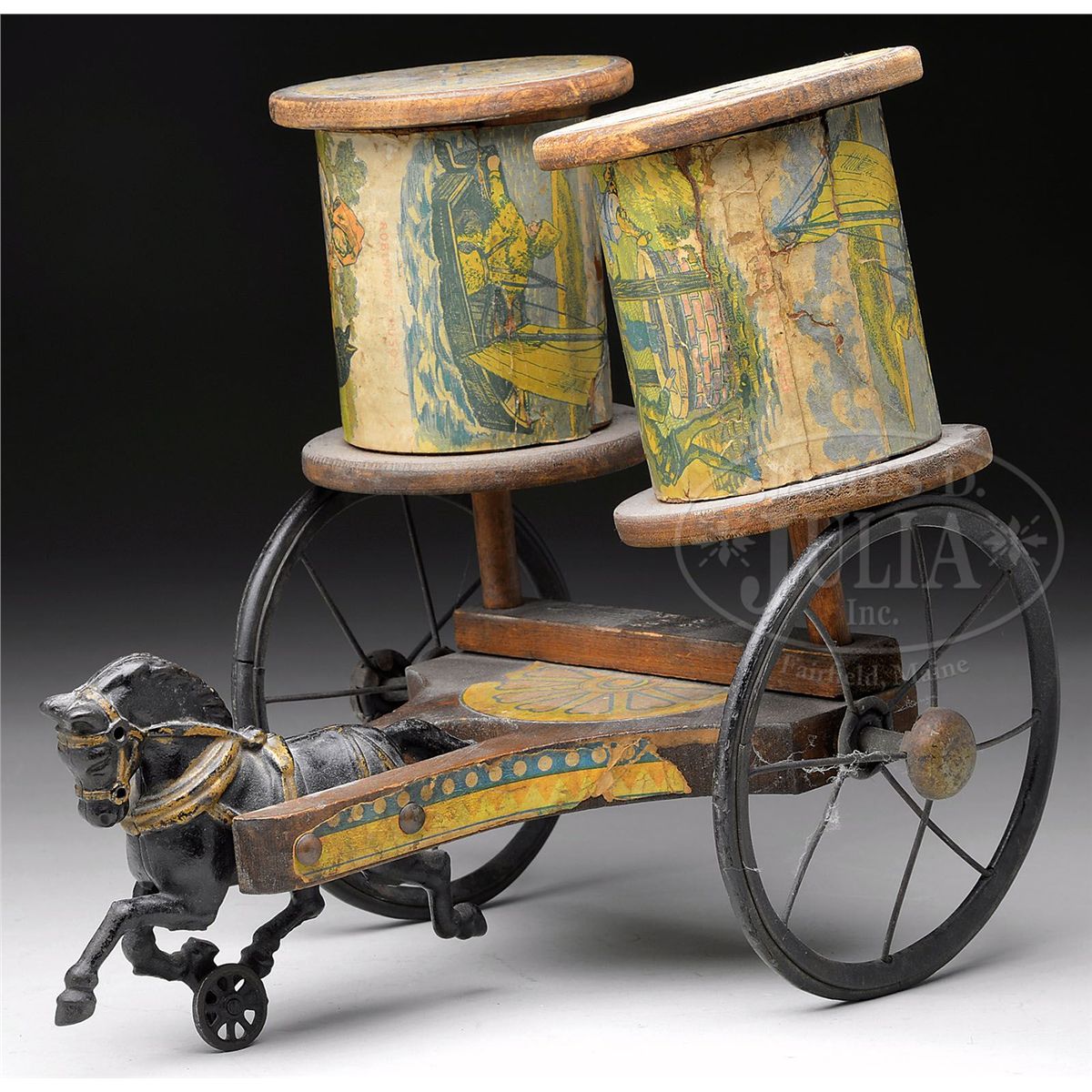 Circa 1920s American pull toy features cast iron horse on wheel, drawing two revolving musical cylinders above. Wood framed toy with rubber edged spoke wheels to rear. Paper on wood cylinders is marked "Little Red Riding Hood" with lithographed images from story. SIZE: 12" l x 11" t. CONDITION: One cylinder does not play music. Light fading to lithographed areas. Overall condition is good. 1-13351
