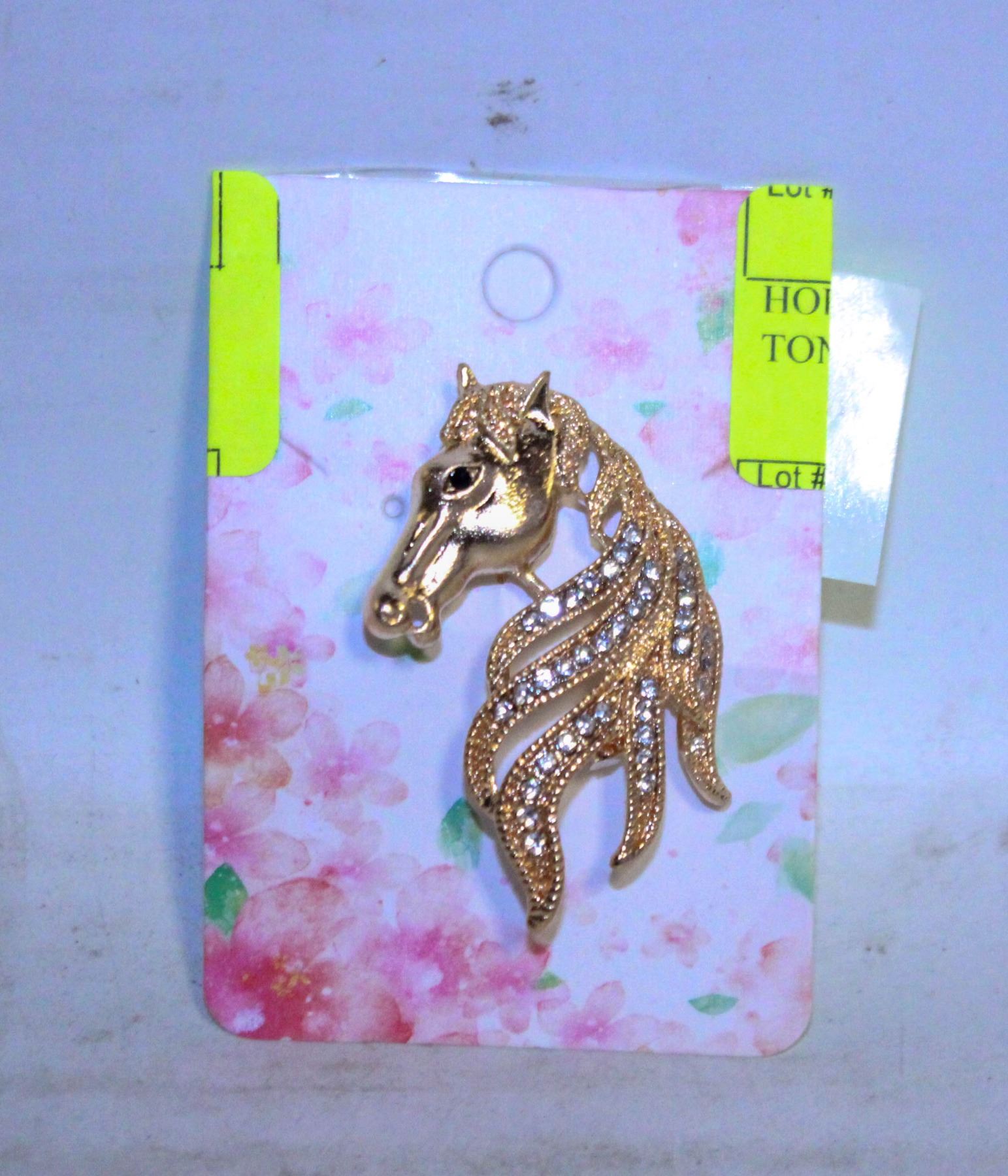HORSE HEAD BROOCH GOLD TONES+STONE 2”