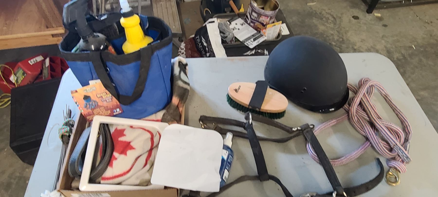 EQUININE RIDING HELMET, HORSE CARE & GROOMING ITEMS, W/ HARNESS & LEAD