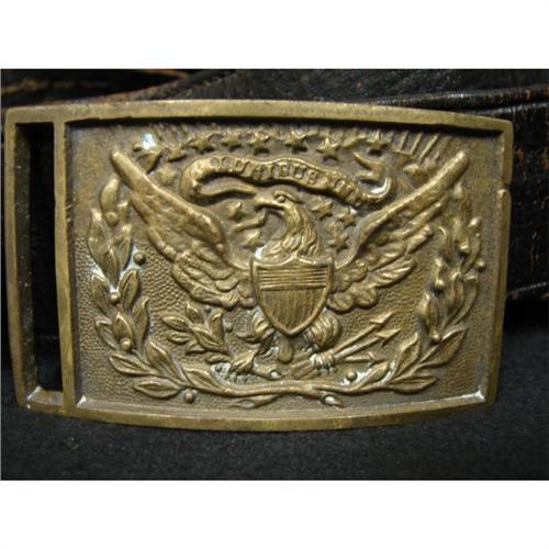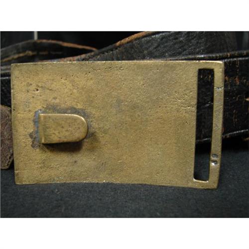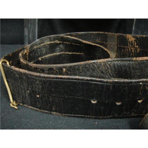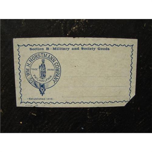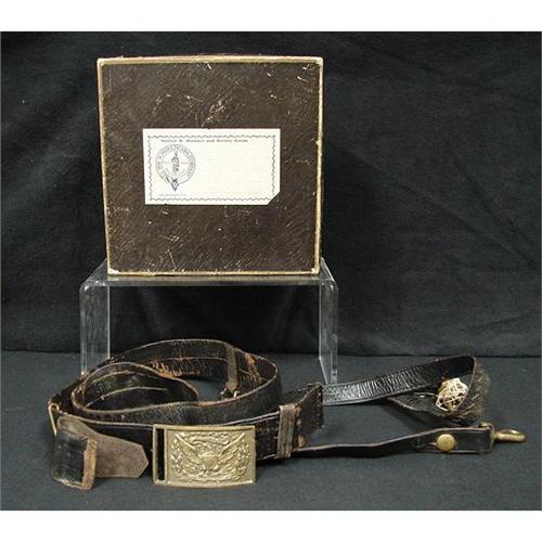 HORSTMANN MODEL 1874 SWORD BELT RIG & PLATE WITH 19th c. HORSTMANN BOX. Intact sword belt shows wear. Unattached belt strap is marked on reverse “Horstmann Bros. & Co./Philadelphia”. M1874 belt plate is unattached to belt and belt clasp is missing. Original Horstmann box retains original label on lid and reads “Section B-Military and Society Goods” and is decorated with Wm. H. Horstmann Company logo. Box is intact and shows some wear.