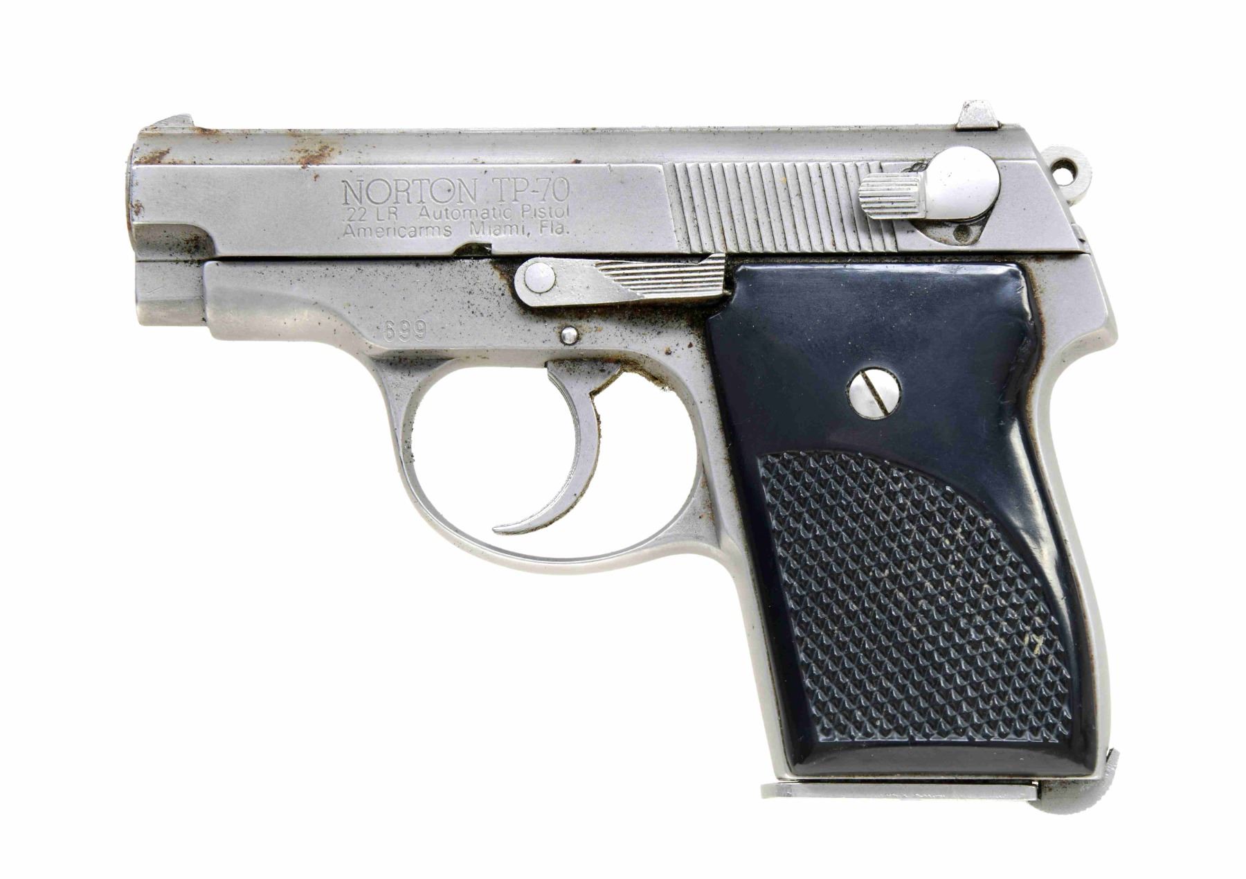 Cal. 22 LR. S# 699. Bbl. 2 1/2". Blade front sight. Square notch rear sight. Budischowsky-designed pocket pistol, made in the USA and marketed by Horton. Stainless finish. Checkered black grips. MAGS: 1-6 rd. UNATTACHED ACCESSORIES: Uncle Mike's Sidekick holster. CONDITION: grips show some handling marks and dirt staining. Metal shows handling wear, scattered oxidation, and dirt staining. Bore is dirty but mostly bright with strong rifling. (24-1275/MJC). MODERN. $250-350.