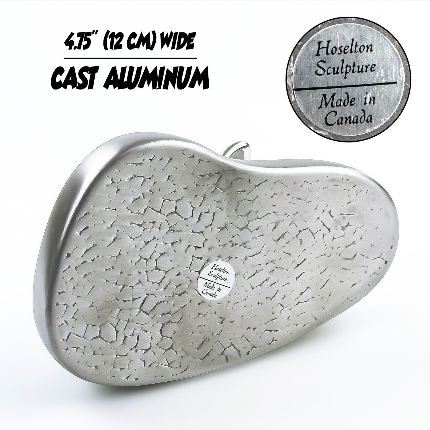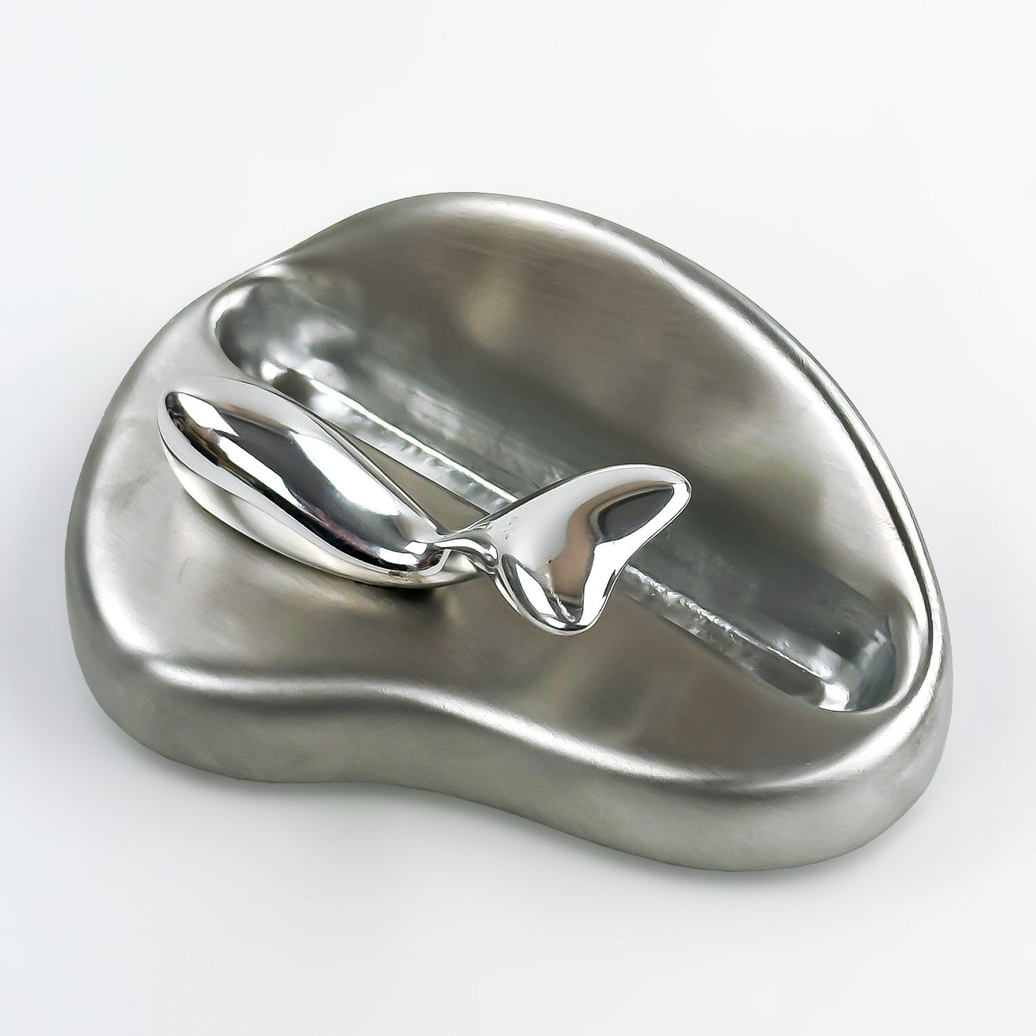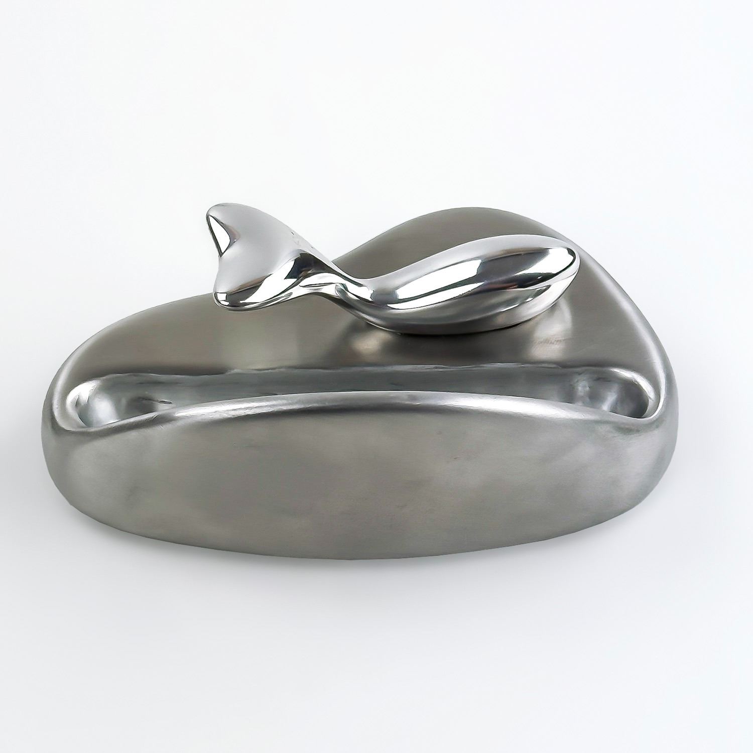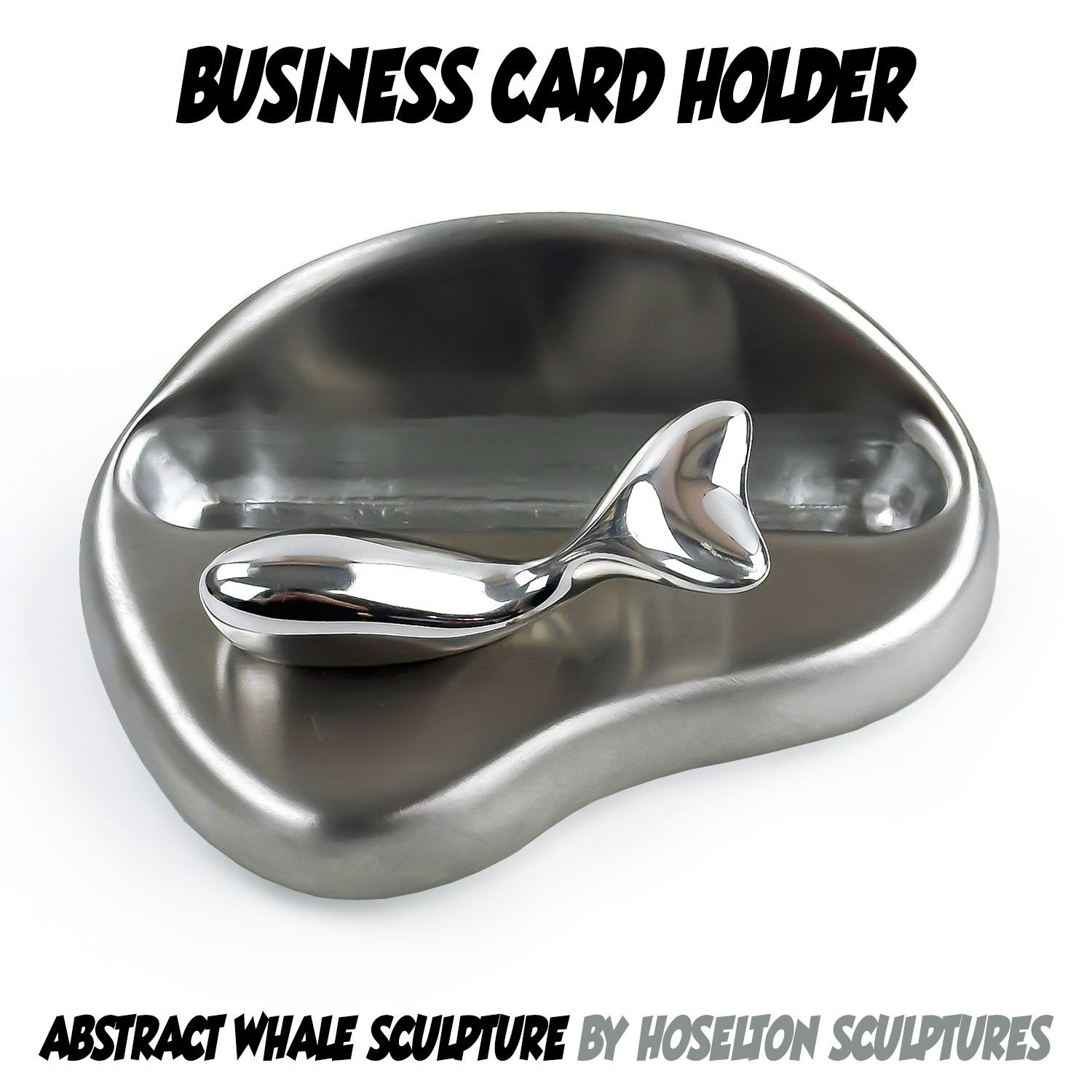#8899 - VINTAGE HAND CRAFTED ABSTRACT WHALE BUSINESS CARD HOLDER - HOSELTON SCULPTURES, CANADA. SAND CAST RECYCLED ALUMINUM ALLOY BY GORDON HOSELTON AND ALLAN BUTTERS. HOME OR OFFICE METAL WHALE OCEAN FISH FIGURINE ART SCULPTURE DECOR. MEASURES 4.75” (12 CM) WIDE BY 3” (7.5 CM) DEEP AND STANDS 2” (5 CM) HIGH. WHALE IS 2.75” (7 CM) LONG