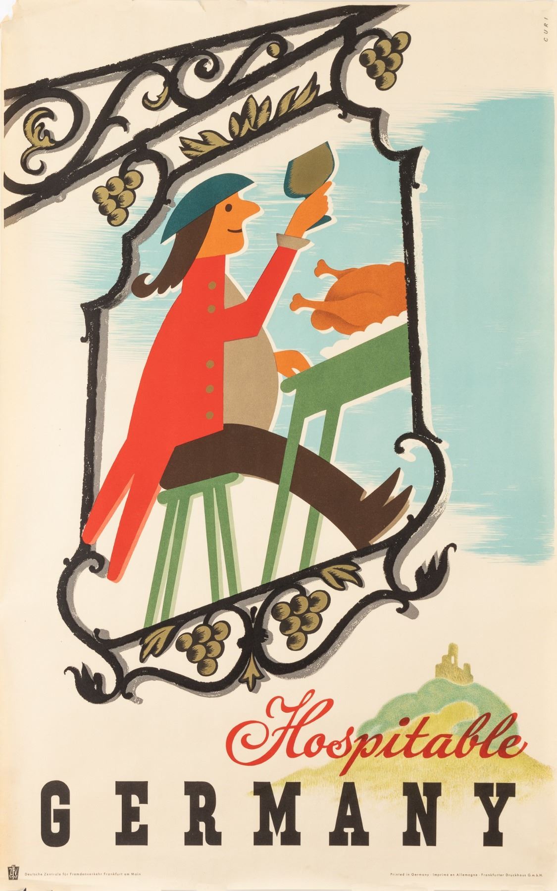 German travel poster 'Hospitable Germany', artwork by Curi, published by German Central Tourist Office, printed in Germany, Frankfurter Druckhaus GmbH, ca. 1950s, 26 x 41 inches. Minor tears. Small tear upper left corner.