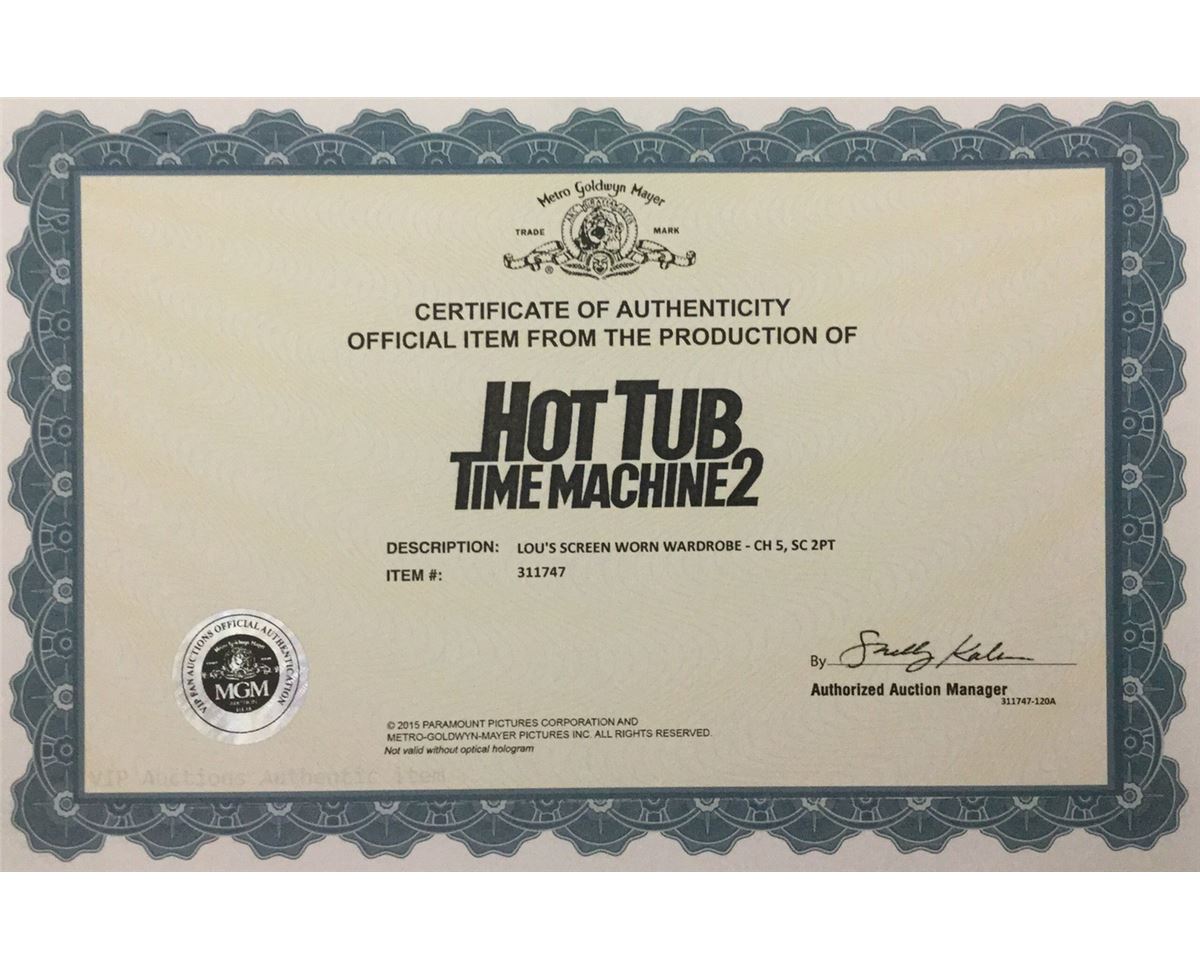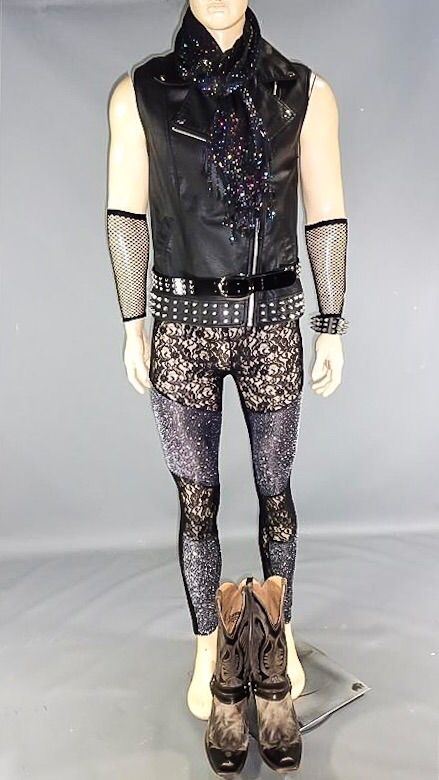 AN OUTFIT SCREEN WORN BY THE ACTOR ROB CORRDRY (LOU) IN THE MOVIE HOT TUB TIME MACHINE 2. THE OUTFIT INCLUDES VEST, SHIRT, SCARF, LEGGINGS, BELTS, ARM SLEEVES, BOOTS AND BRACELET. THE OUTFIT IS ACCOMPANIED BY A STUDIO CERTIFICATE OF AUTHENTICITY.