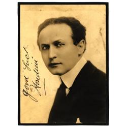 <b>349A. HARRY HOUDINI </b>(1874 - 1926) American magician known for his ability to extricate himself from handcuffs and locked and sealed containers of all kinds, and campaigned against mind readers, mediums, and other charlatans. S.P. <i>"good luck Houdini"</i>, 5" x 7" sepia bust portrait of the illusionist looking at the camera. Signed vertically along the left margin. Glue stains and light soiling do little to detract from this striking image. Mounted to another sheet, Very good. <b>$1,000-1,500</b>