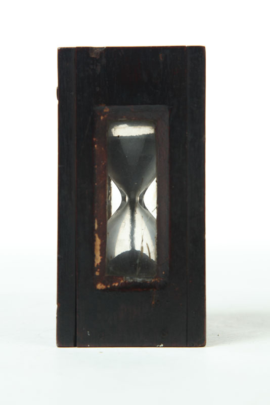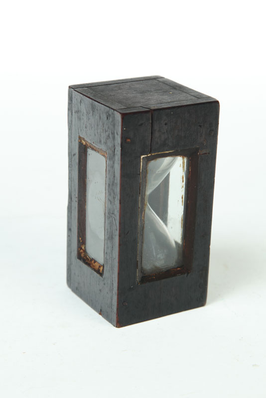 American, 19th century. Blown glass hour glass with black sand in a pine frame with glass panels and a painted case, 5"h., and two fragment mirrors in painted later frames, 8"h. 5 1/2"w., 4"h.