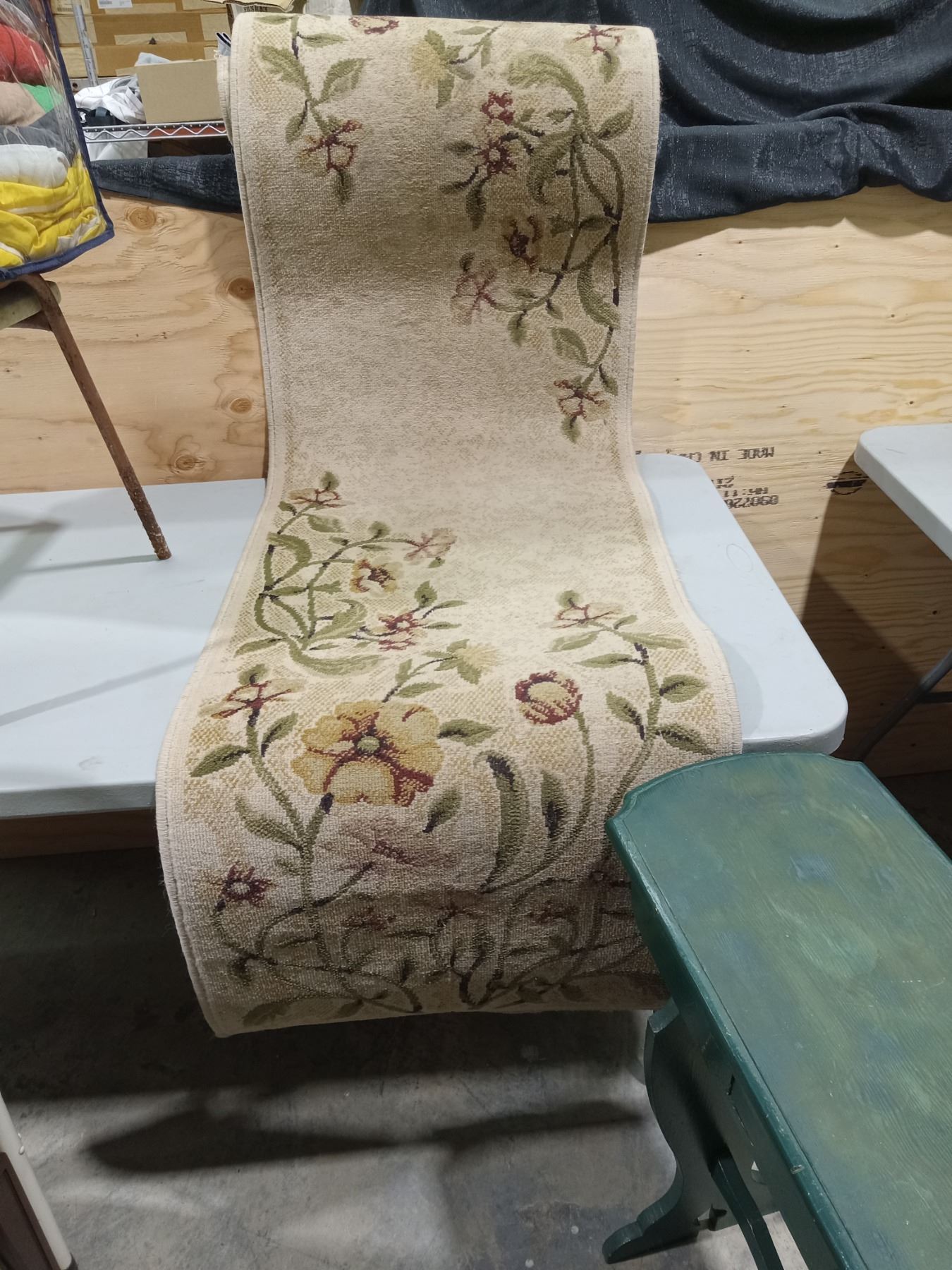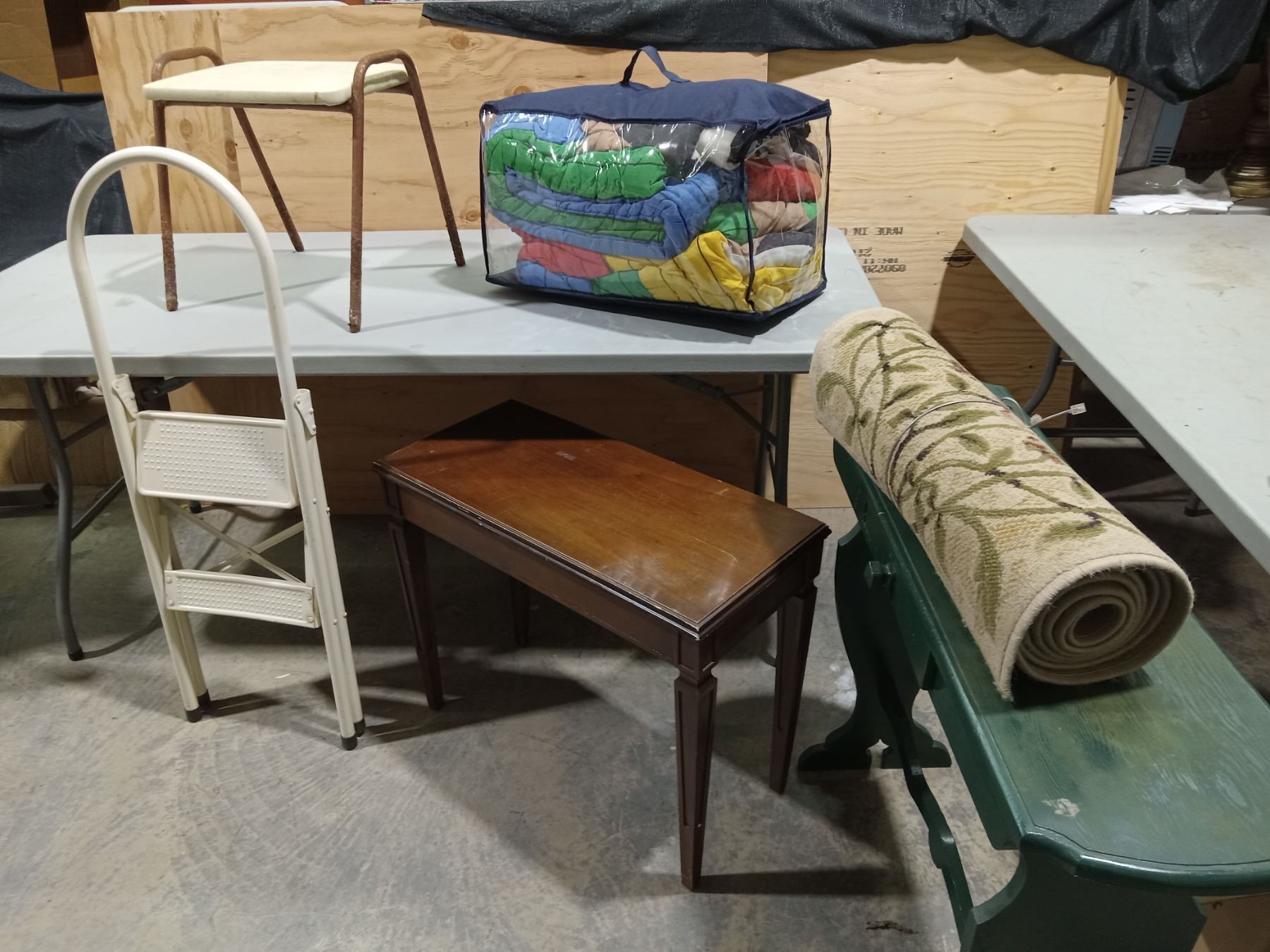 HOUSE ENTRY/HALL TABLE + BEDROOM WOOD STORAGE BENCH/HALL CARPET RUNNER