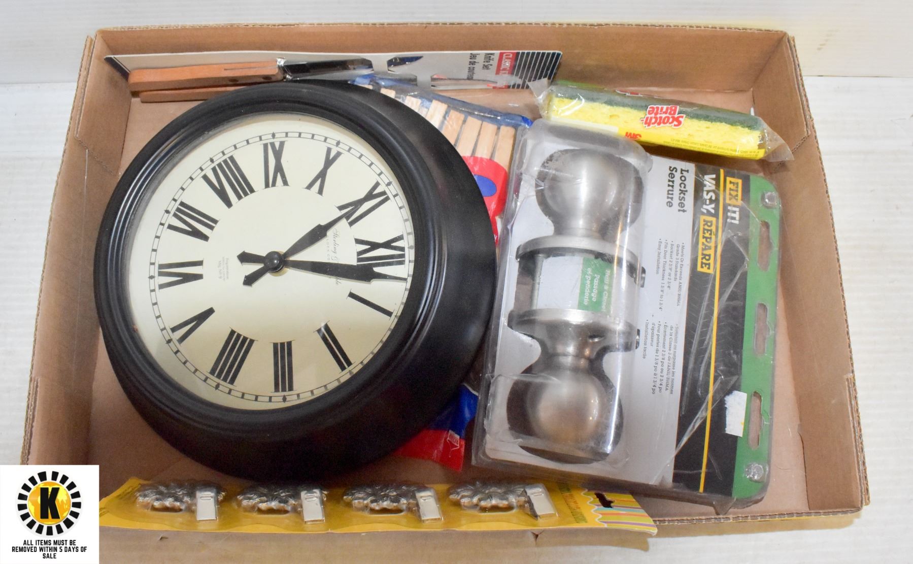 HOUSEHOLD LOT INCLUDES CLOCK, CLOTHES PINS AND A