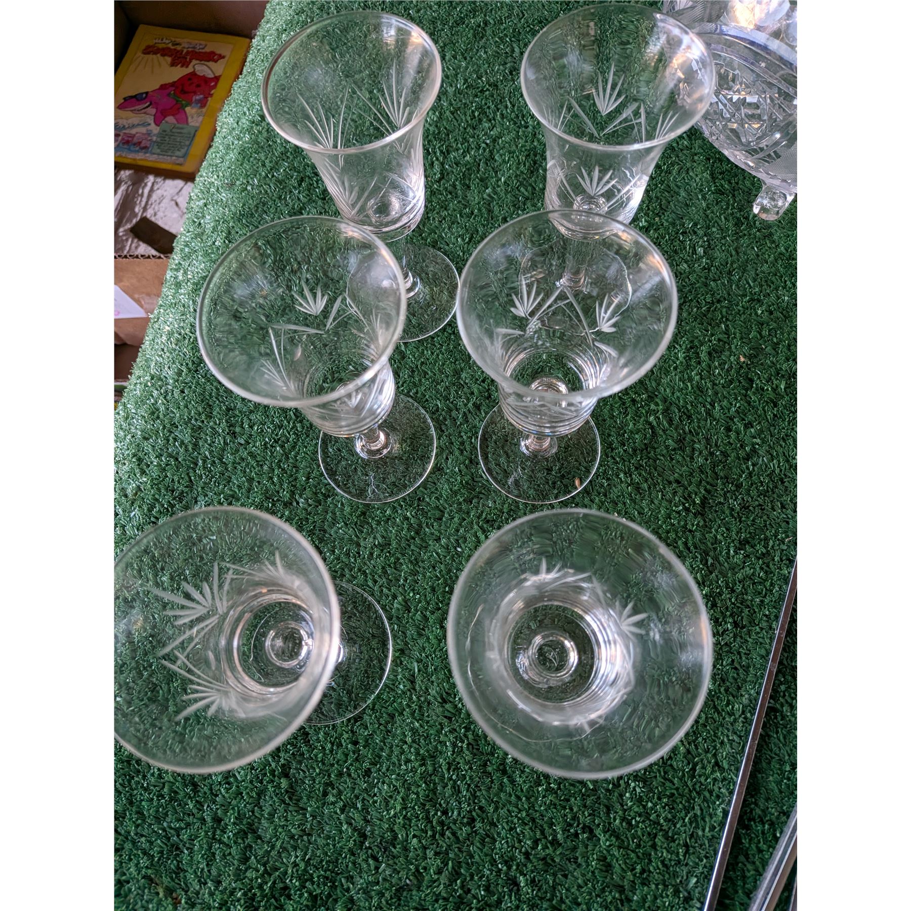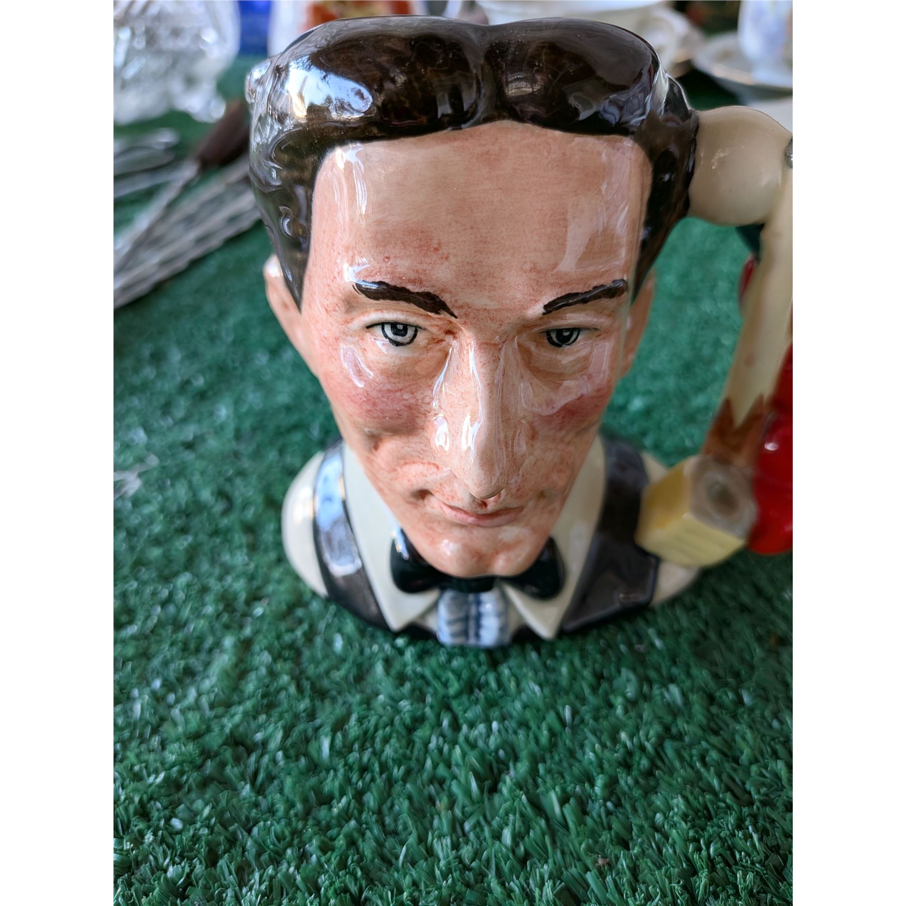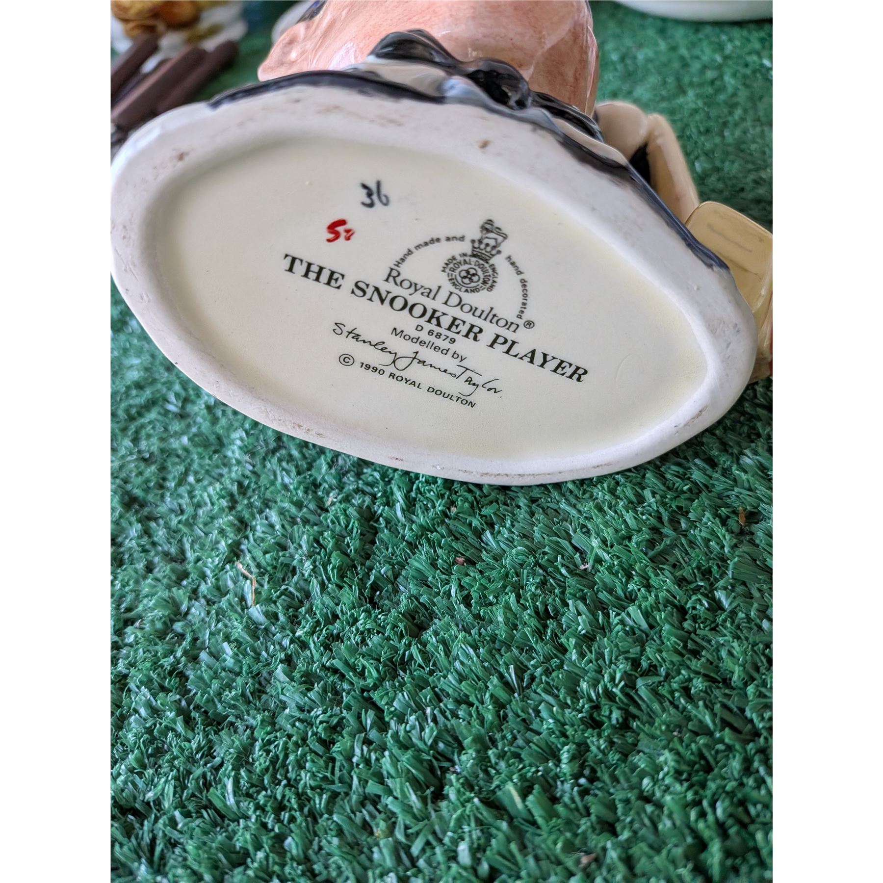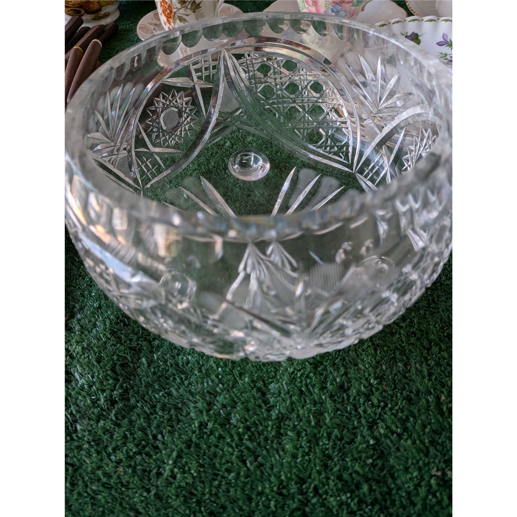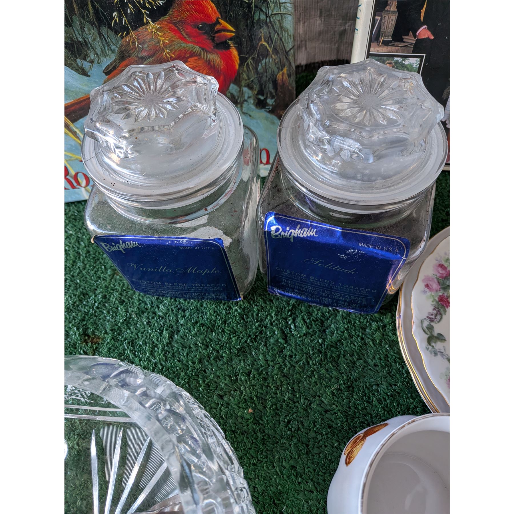 Old pipe tobacco jars, Snooker player creamer, Royals glass, 6 tea cups & saucers, 13 mismatched saucers, 3 small 5" plates, one wooden flower arrangement stand , large crystal bowl.