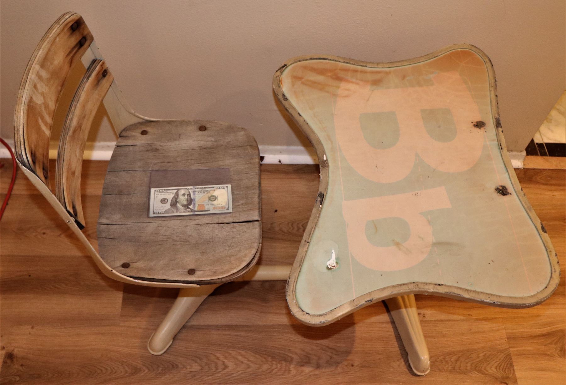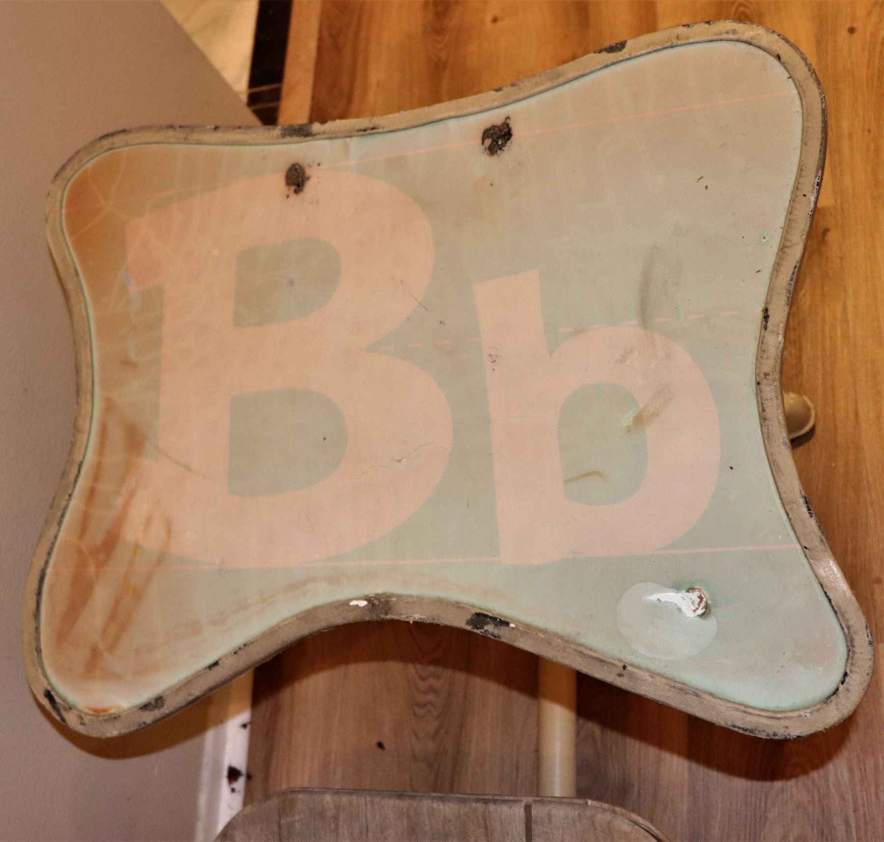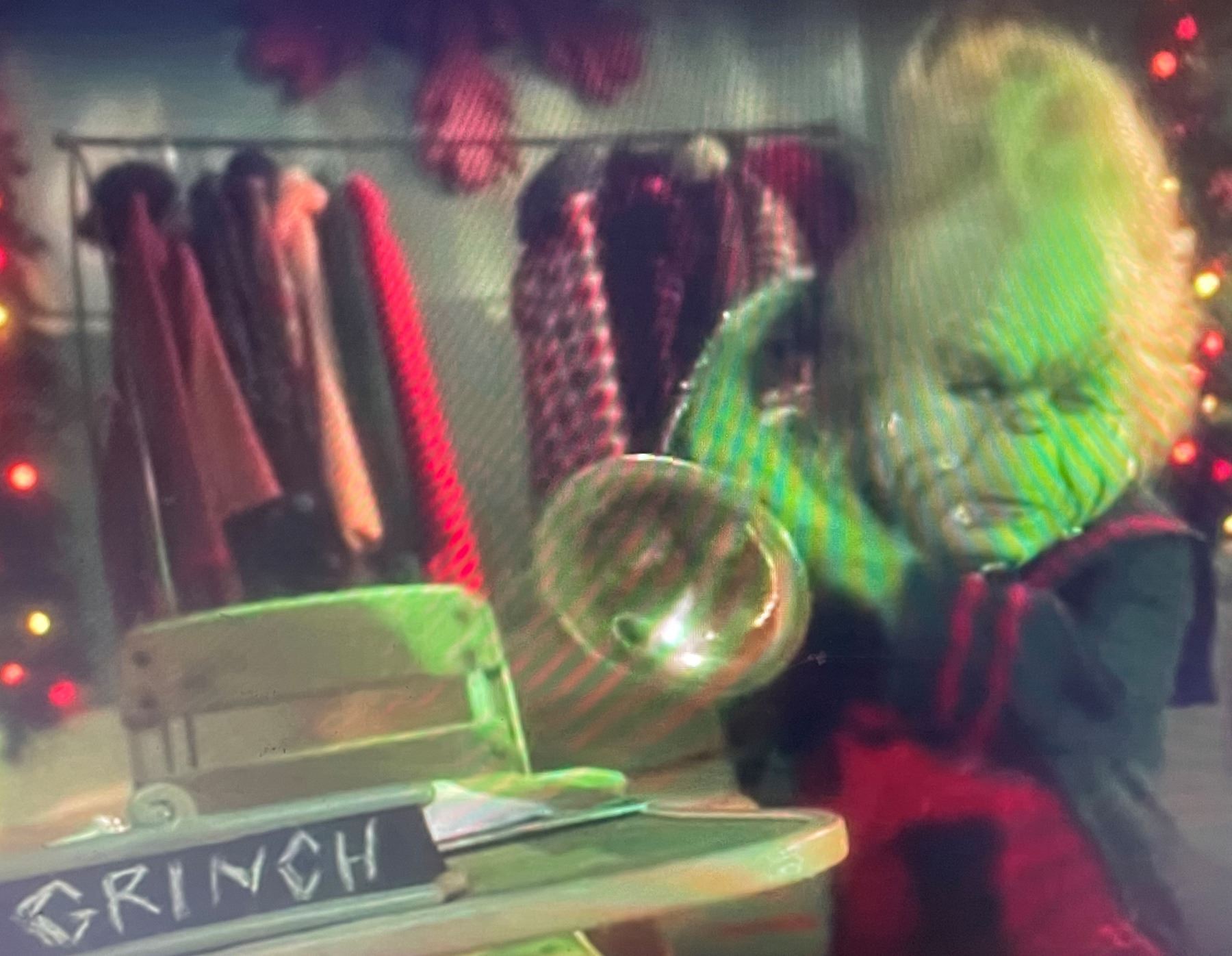 The most obvious Match is as Willy's Desk[2:46 in clip], but this was also used in the scene where the Grinch puts his foot on the desk. If you look close, you can tell it is a B! [5:25 in clip]. No other letter works.