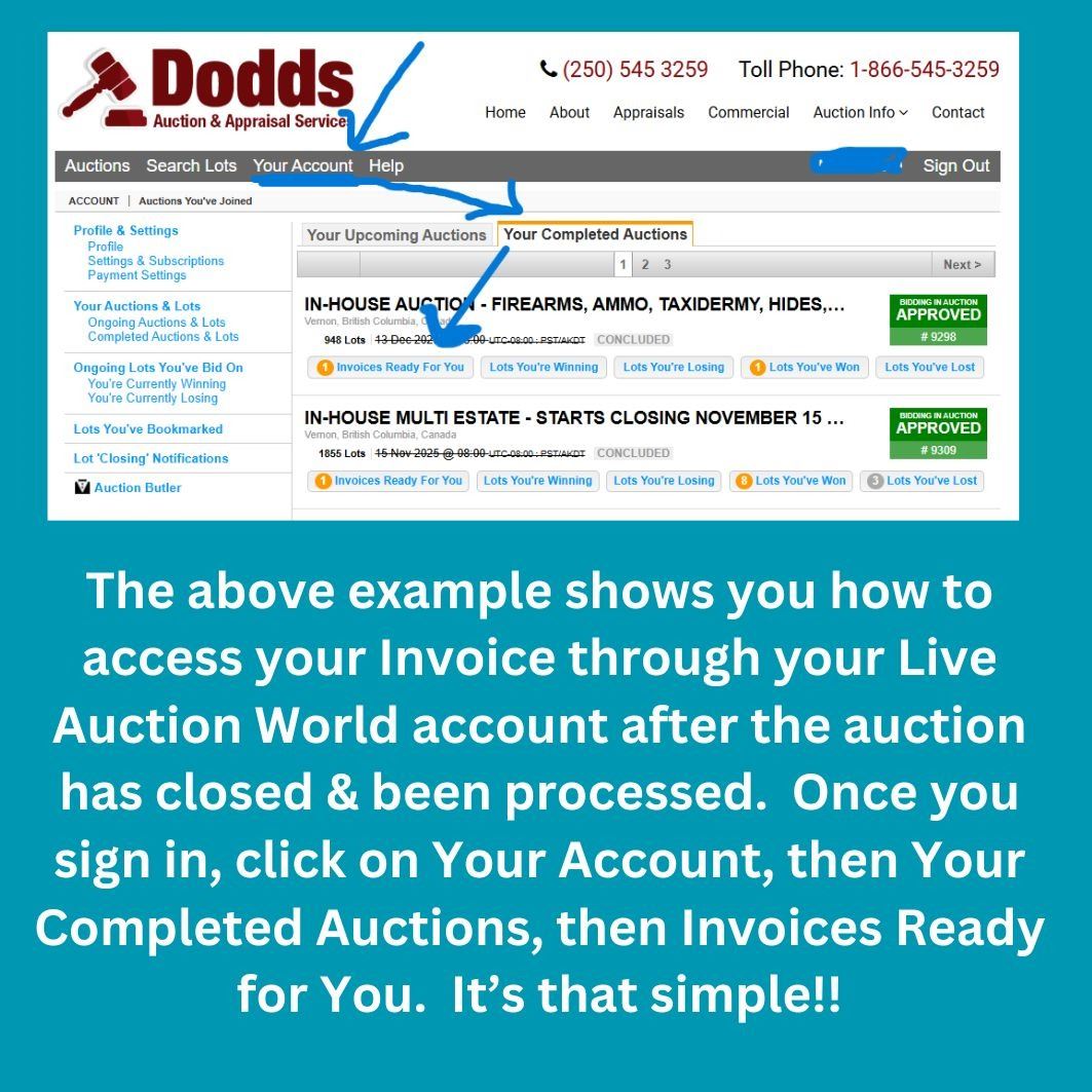 Invoices are available after the auction closes through your Live Auction World Account. If paying by e-transfer, send to: bob@doddsauction.com (auto-deposited)