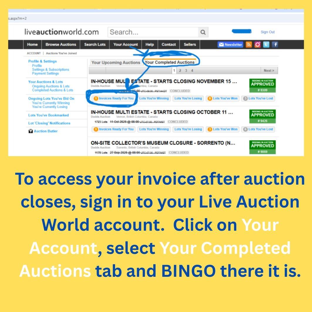 Invoices are available after the auction closes through your Live Auction World Account. If paying by e-transfer, send to: bob@doddsauction.com (auto-deposited)