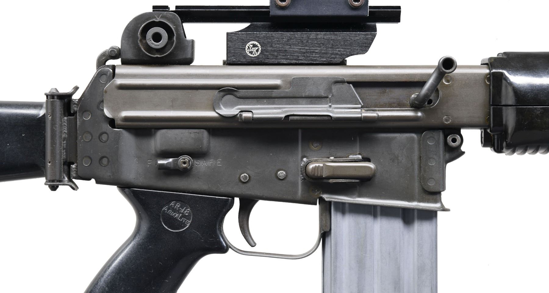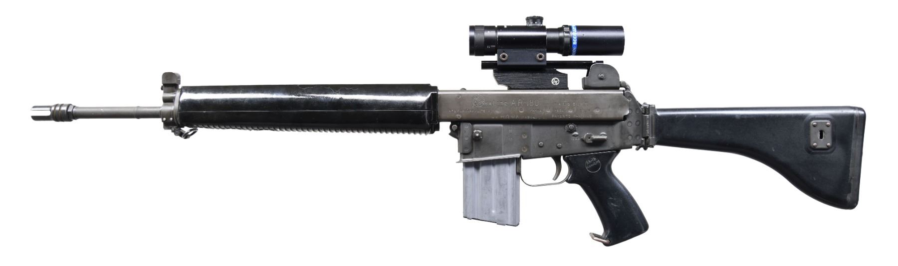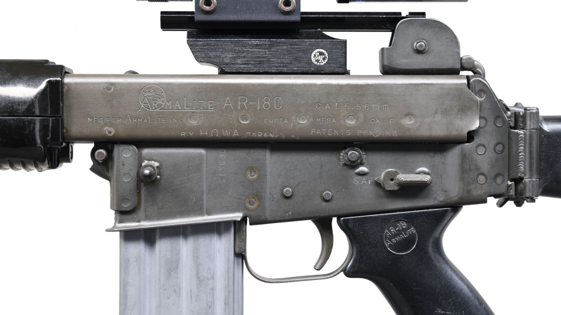 Cal. 5.56mm. S# S11800. Bbl. 18". The original ArmaLite AR-18 was designed in 1963 in CA. as a potential alternative for the U.S. military. When it started to look as though it would not be adopted as a standard service rifle, production was licensed to Howa Machinery Co. in Japan where they began production in 1967. Because military sales to U.S. were effected by American-Japanese treaty agreements that forbid Japan in selling to arms to "belligerent nations", it was determined rifles could not be sold to the U.S. due to our involvement in Vietnam. In 1974 ArmaLite & Sterling Ltd. in England signed a production agreement to manufacture both the AR-18 (Select-Fire version) & the AR-180 (the semi automatic commercial version) & started manufacturing rifles in 1975. This particular example was mfg. for ArmaLite Inc. in Costa Mesa, CA. by Howa Japan under ArmaLite patents. Serial number located on lower receiver. It is a gas operated piston driven semi auto rifle w/ a left side folding stock. Front sight is an elevation adjustable protected post. Rear sight is a windage adjustable dual aperture peep sight marked 200 & 400. Currently sporting 3x21mm Beeman SS2 scope w/ duplex reticle. The rifle is charged by a reciprocating handle on the right side of the rifle. Ambidextrous safety selector controls, black plastic furniture. Proper muzzle brake & correct partial bayonet lug w/ sling swivel. MAGS: 1 aluminum 20 rd. w/ ArmaLite AR-18 floorplate. CONDITION: finish is complete on all exposed metal surfaces w/ some thinning on high spots & in areas of mechanical intervention. Stock locks tightly in open & closed positions. Some blemishing on handguards, primarily lower, consisting of some light bubbling & thin crack at 6 O'clock. Bore is bright w/ strong rifling. Fire control mechanism appears to function correctly when cycled by hand. PROVENANCE: Lifelong Collection of Terrance McCarty. (24-393/JZ). MODERN. $1,000-1,500.