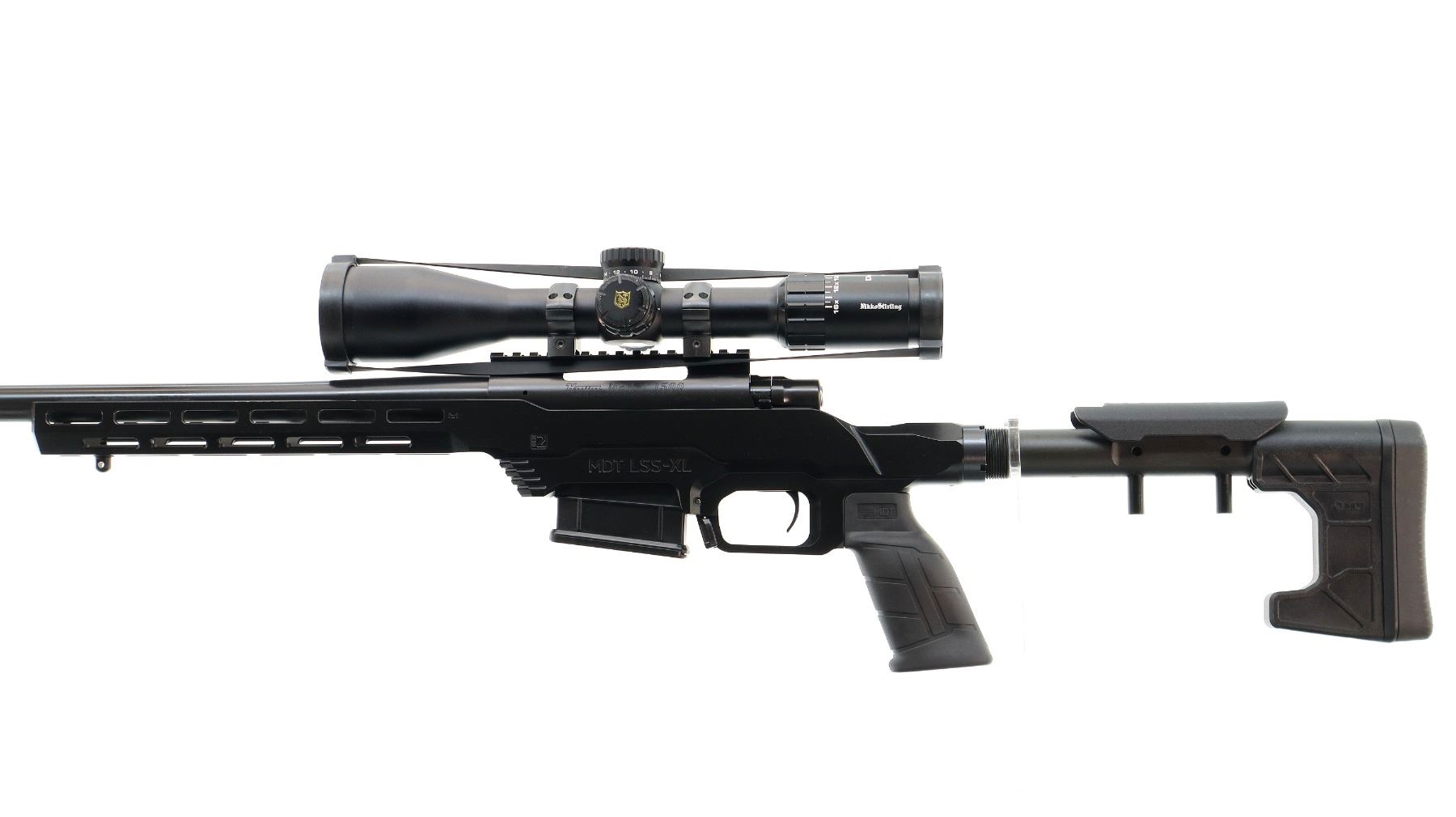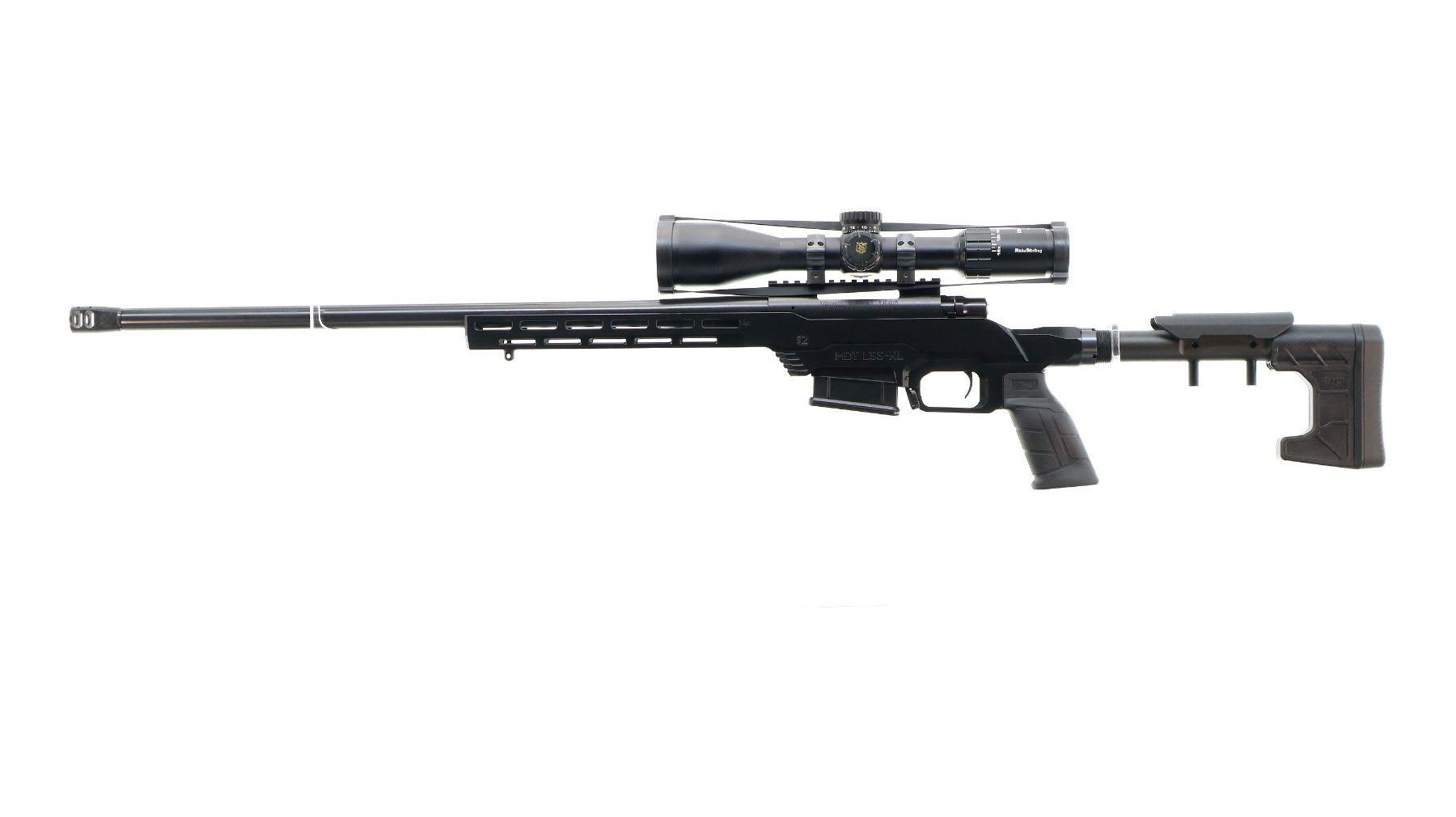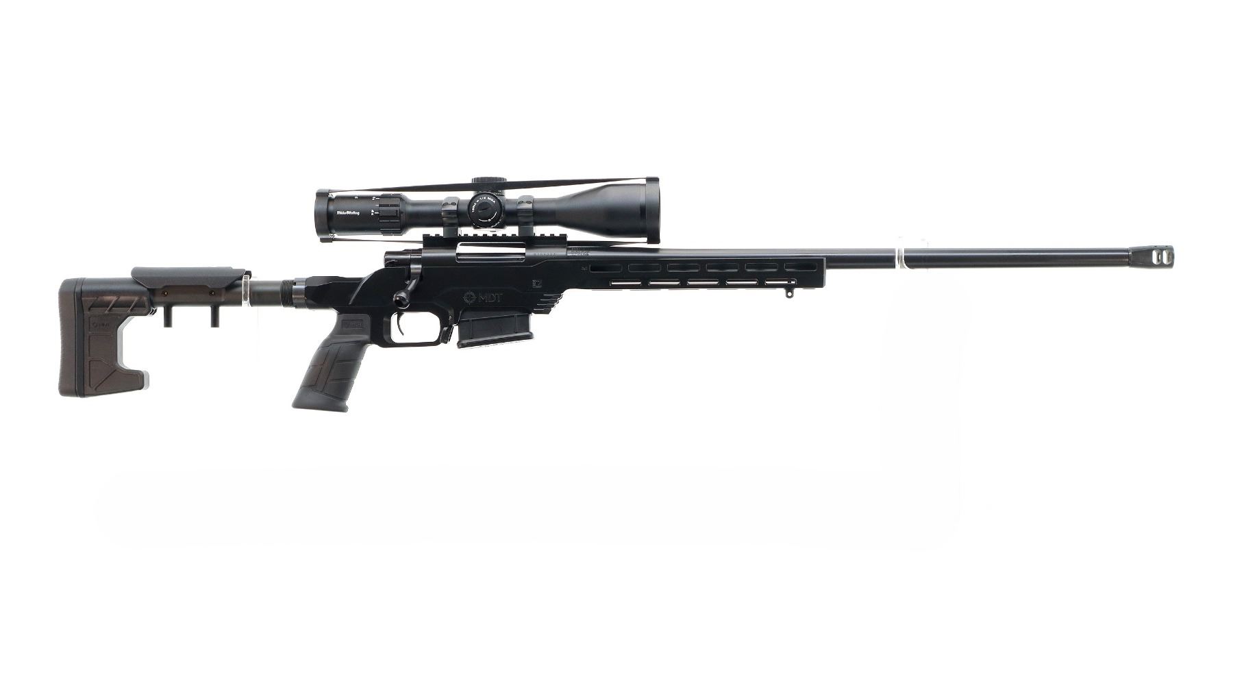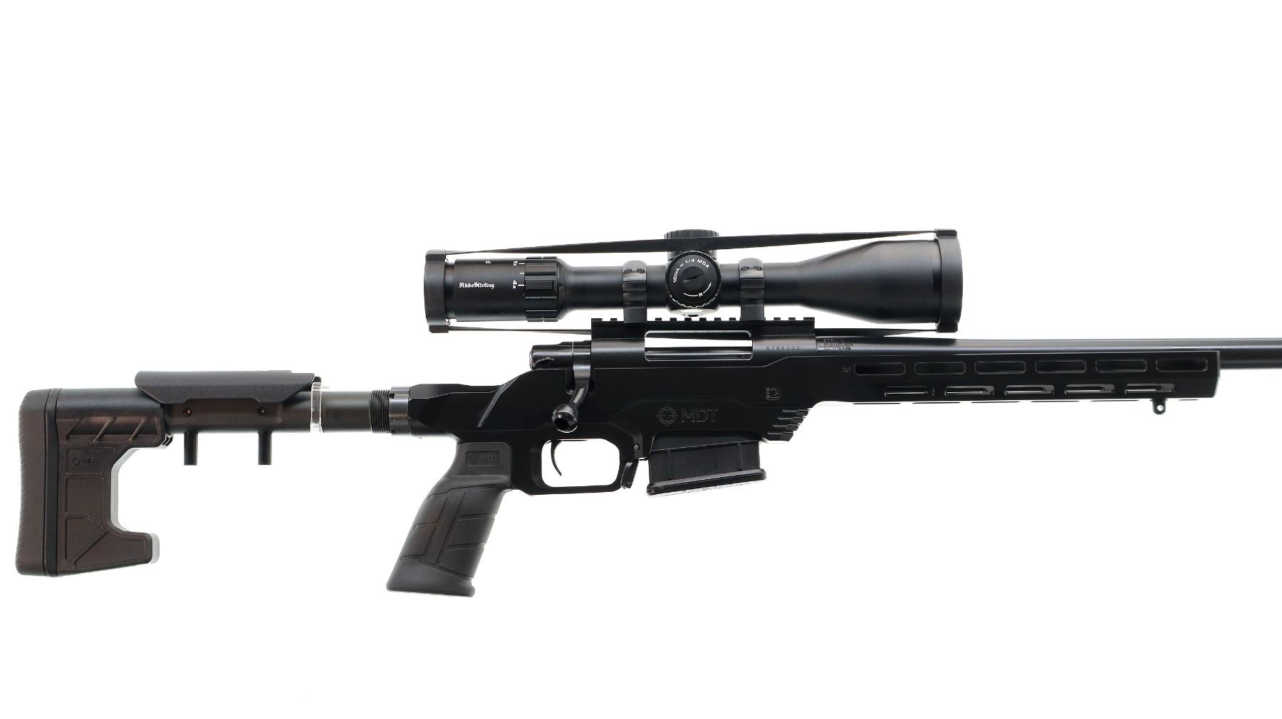 Main Description: No sights, Satin blued metal finish, heavy barrel threaded at muzzle with ported brake installed, receiver drilled and tapped with Niko Sterling Diamond LR 4-16x50 Illuminated scope installed, clear optics with half Mil Dot reticle, illuminated red and green functions. Smooth bolt knob. One piece black anodized MDT LSS-XL Gen 2 stock chassis, ventilated forearm, grooved black rubber MDT pistol grip, adjustable cheek rest, hooked butt with black rubber recoil pad, ambi mag release, front swivel stud. Accessories include: NcStar adjustable folding bipod, black Hogue over mold stock with original trigger guard and screws, factory sticker and hang tags, spare Howa hinged floor plate trigger guard assembly.