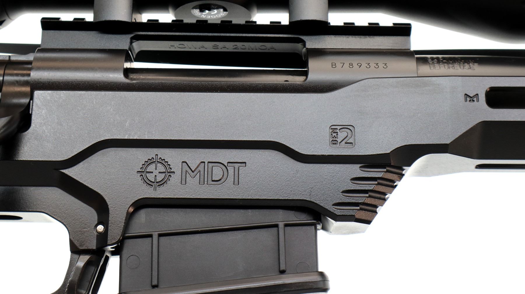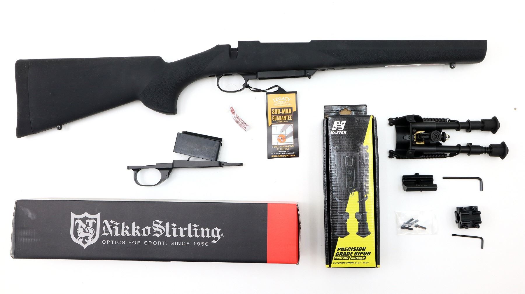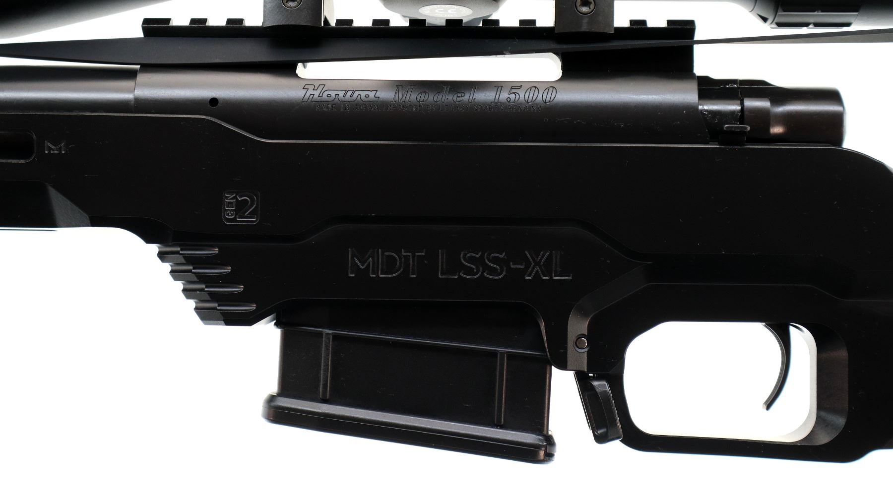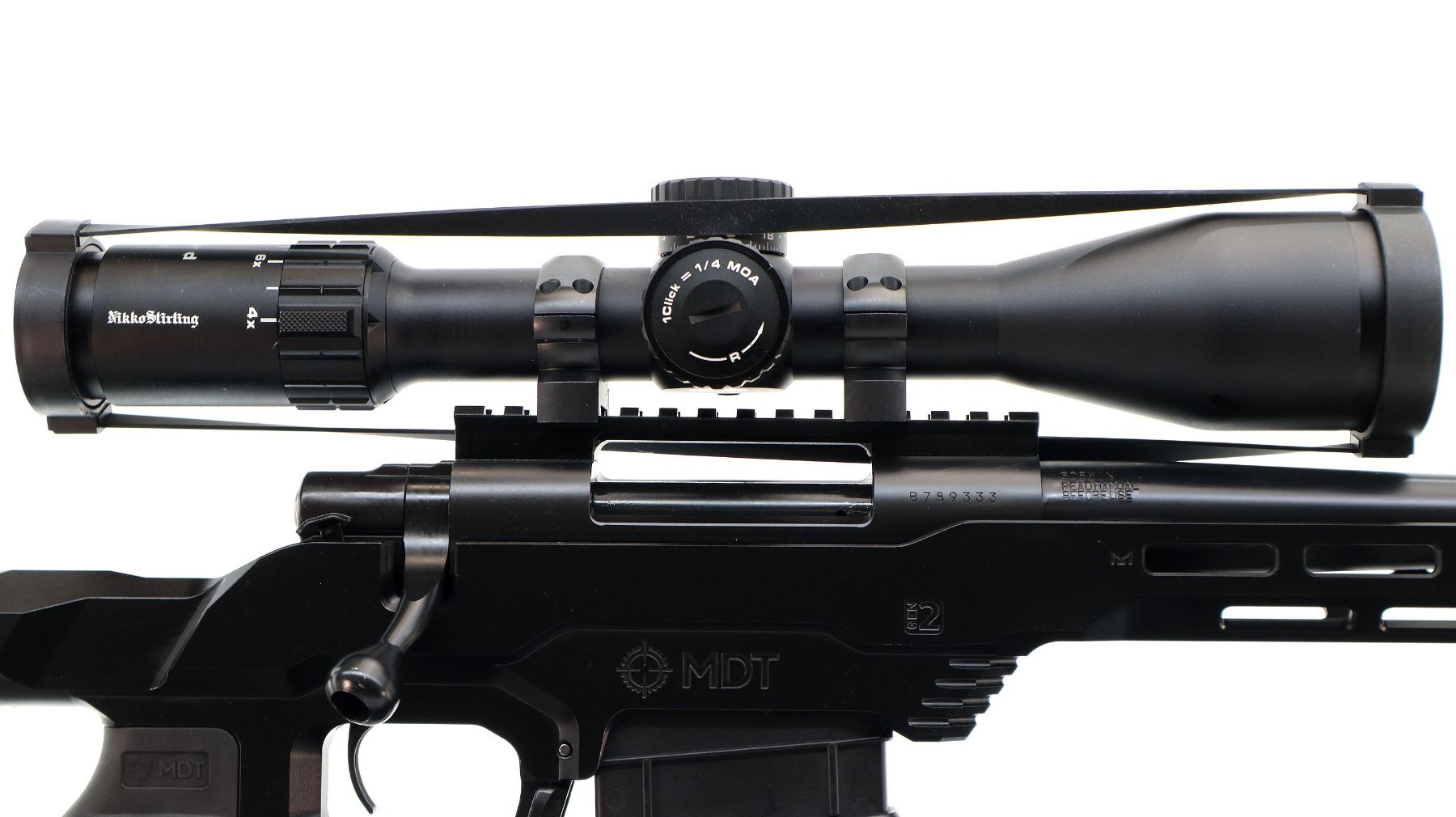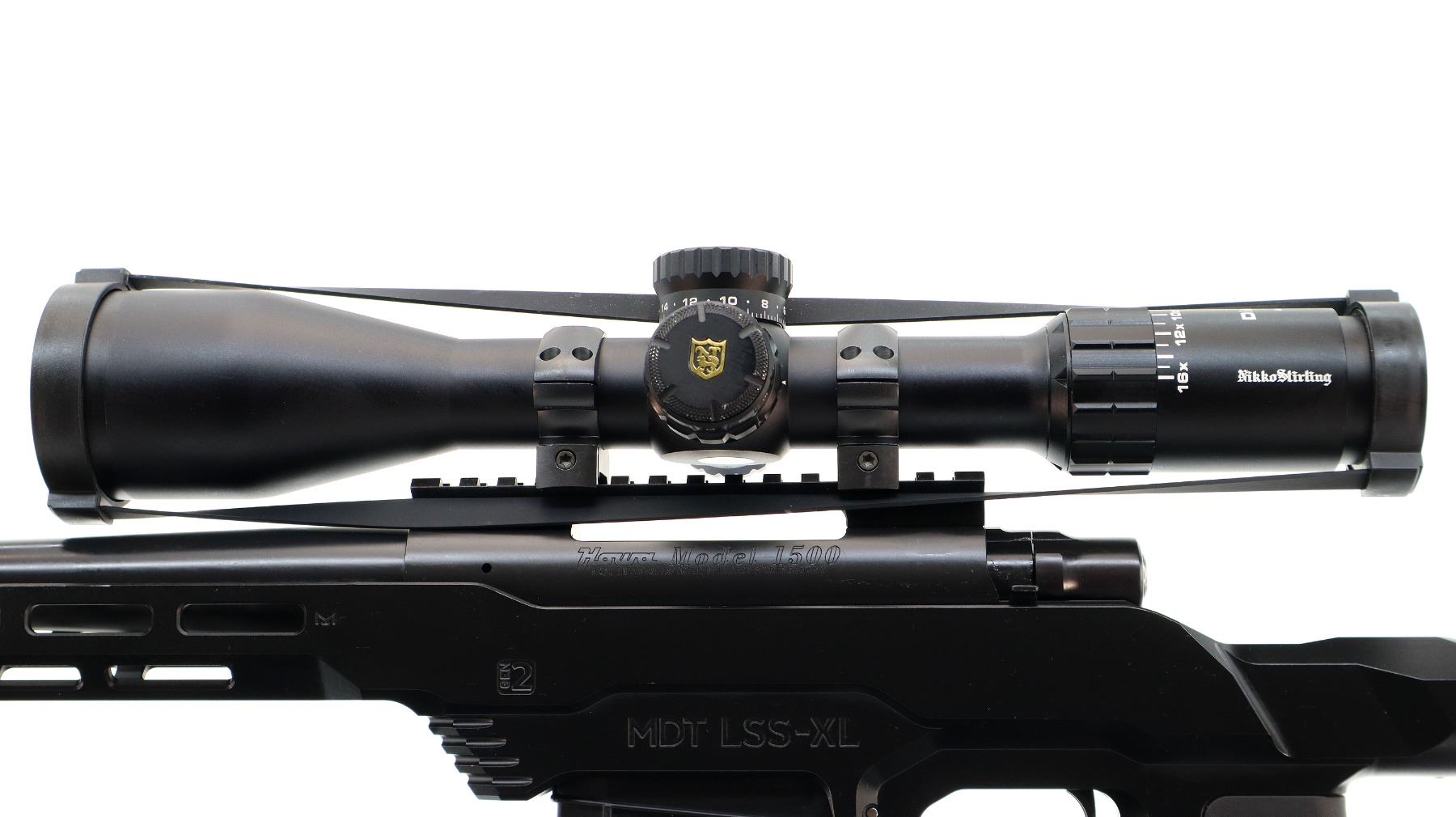 Main Description: No sights, Satin blued metal finish, heavy barrel threaded at muzzle with ported brake installed, receiver drilled and tapped with Niko Sterling Diamond LR 4-16x50 Illuminated scope installed, clear optics with half Mil Dot reticle, illuminated red and green functions. Smooth bolt knob. One piece black anodized MDT LSS-XL Gen 2 stock chassis, ventilated forearm, grooved black rubber MDT pistol grip, adjustable cheek rest, hooked butt with black rubber recoil pad, ambi mag release, front swivel stud. Accessories include: NcStar adjustable folding bipod, black Hogue over mold stock with original trigger guard and screws, factory sticker and hang tags, spare Howa hinged floor plate trigger guard assembly.